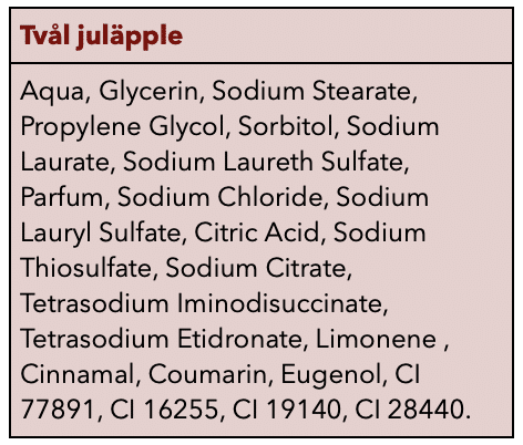 Ingredienser : Aqua, Glycerin, Sodium Stearate, Propylene Glycol, Sorbitol, Sodium Laurate, Sodium Laureth Sulfate, Parfum, Sodium Chloride, Sodium Lauryl Sulfate, Citric Acid, Sodium Thiosulfate, Sodium Citrate, Tetrasodium Iminodisuccinate, Tetrasodium Etidronate, Benzyl Benzonate, Coumarin, Limonene, Cinnamal, Coumarin, Eugenol, CI 77891, CI 19140, CI 16255, CI 28440