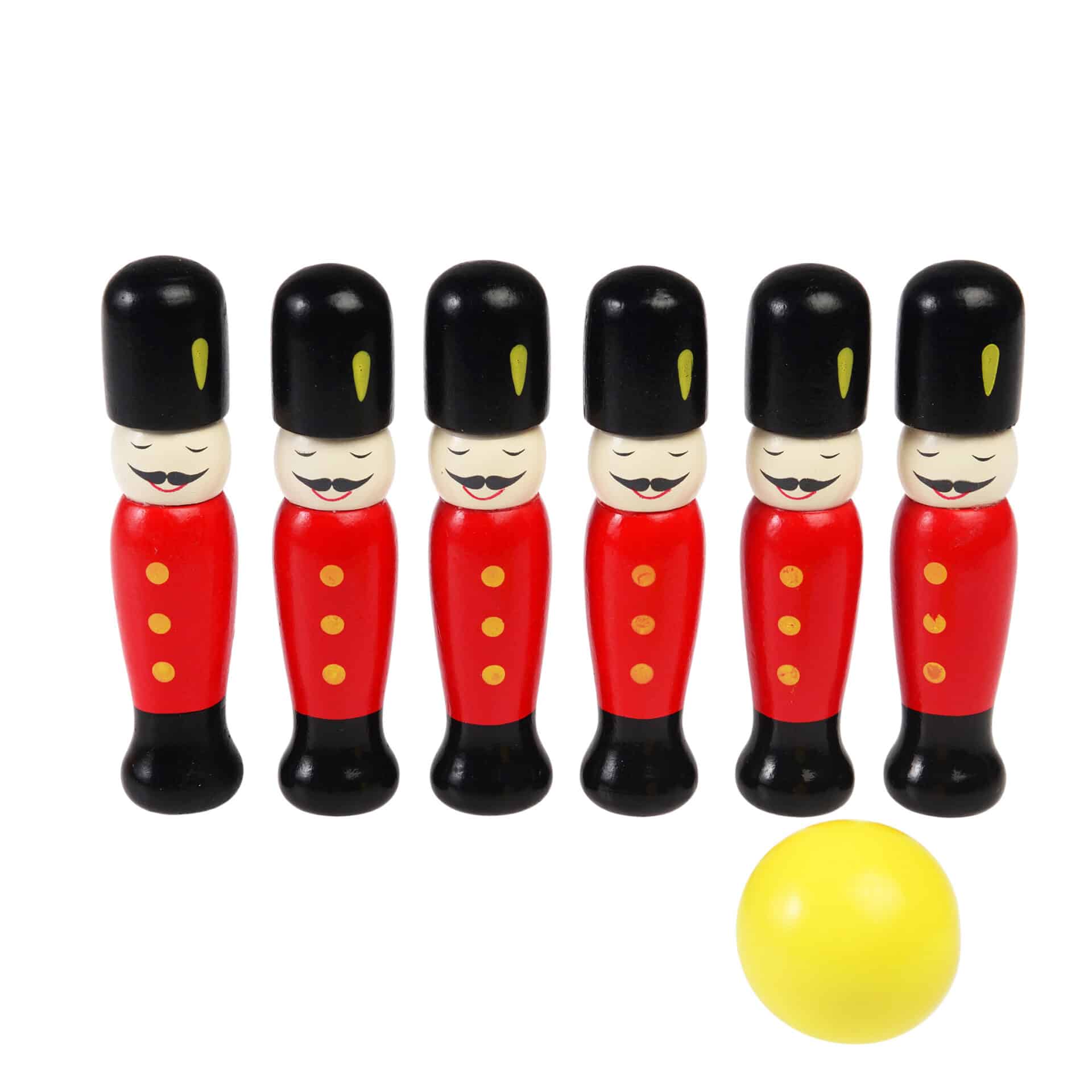 Keglerne forestiller soldater, hvilket gør det endnu sjovere at vælte dem med træbolden.
