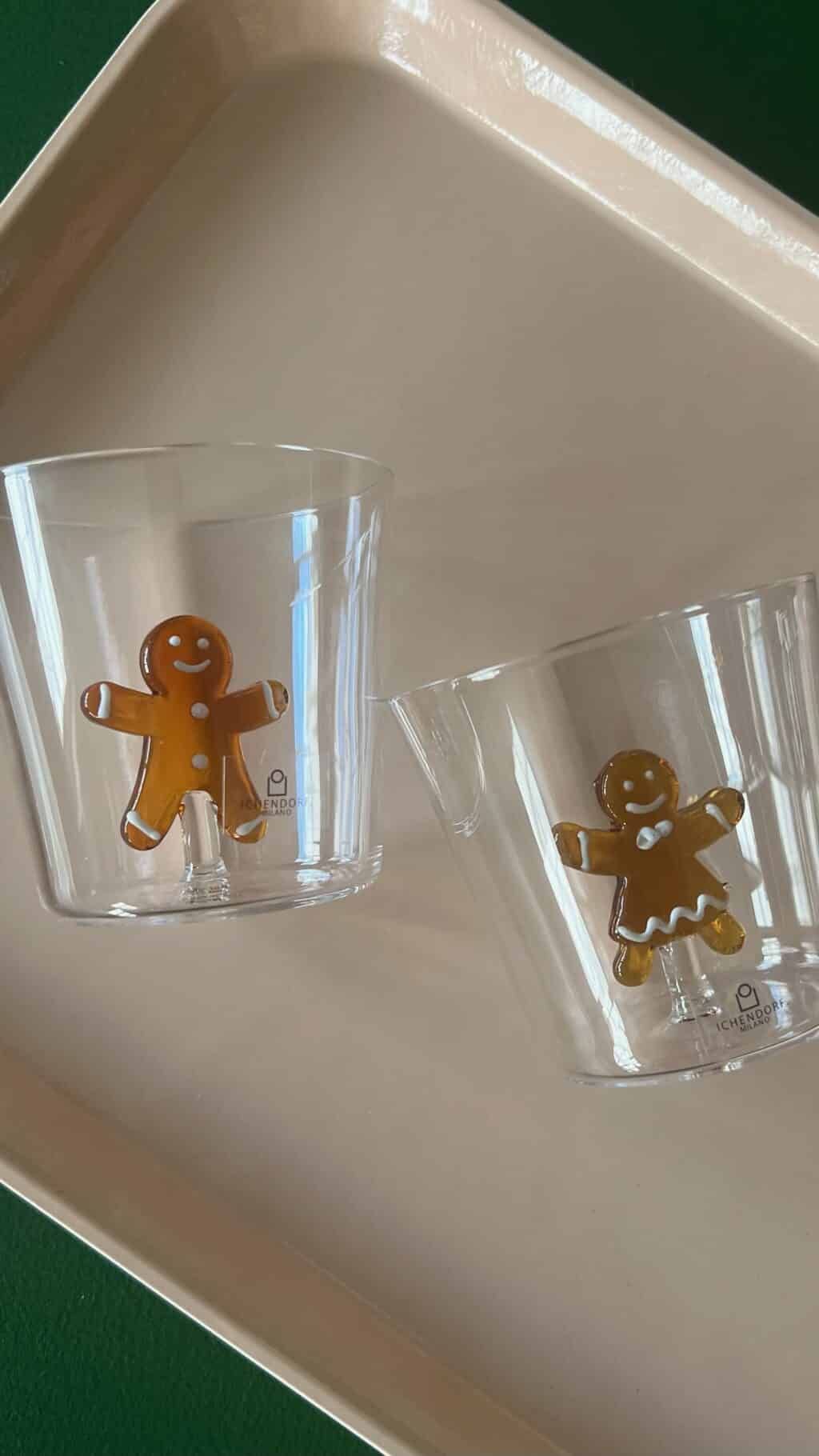 Drikkeglassene er helt enkle og klassiske i formen, men indeni glasene er der den sødeste peberkagemand og peberkagekone.