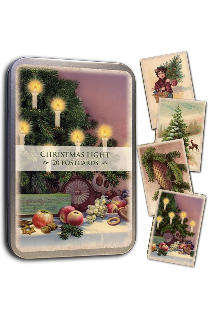 Julekortene kommer i en fin metalæske, som også er virkelig dekorativ at have liggende fremme.