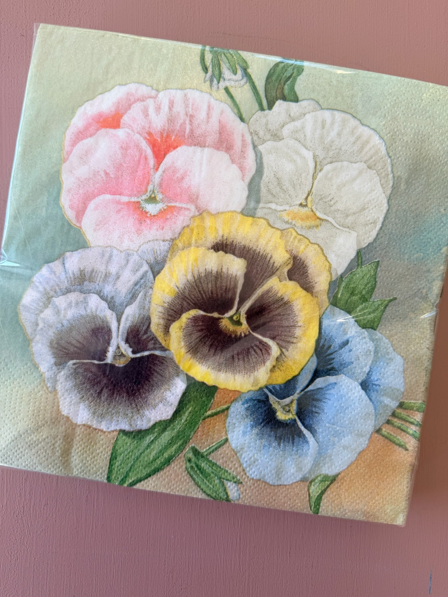 Blomsterservietterne har det fineste motiv af skønne stedmoderblomster.