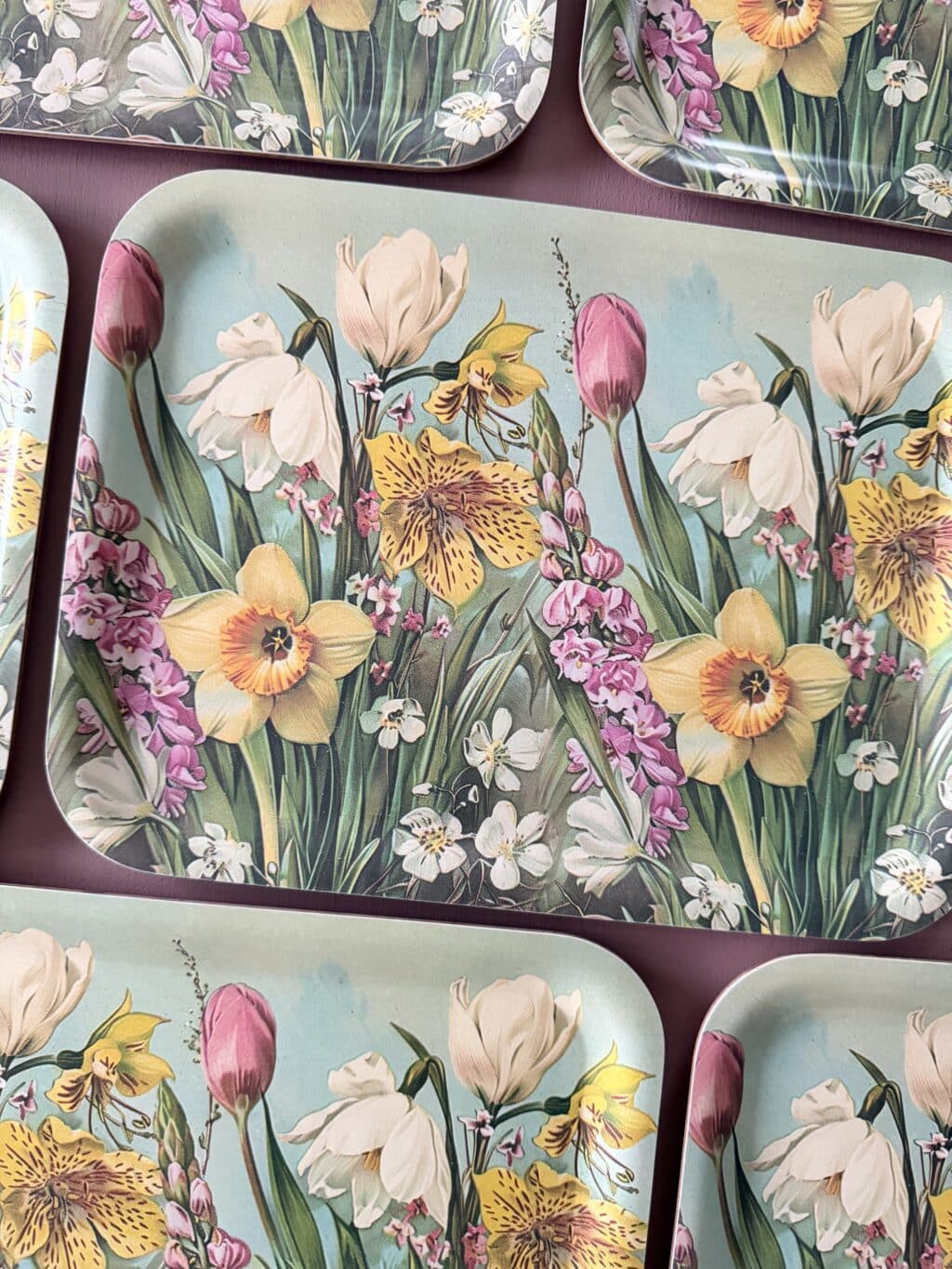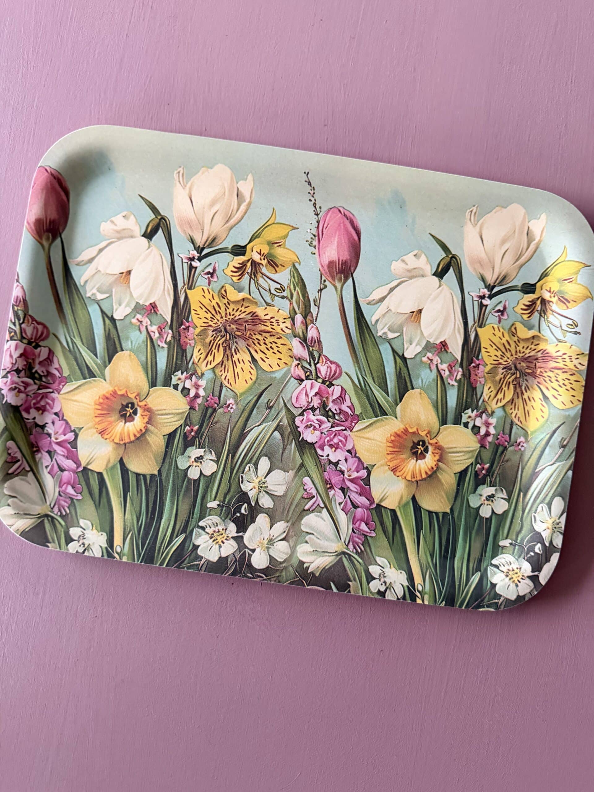 Denne charmerende bakke er prydet med et smukt motiv af påskeblomster i flotte påskenuancer, udført i elegant vintage stil.