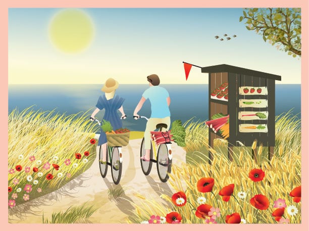 En cykeltur mod vandet, der leder dig forbi marker med valmuer og en hyggelig lille vejbod. Du kan nærmest mærke solens stråler i ansigtet og den milde brise, når du kigger på motivet her. Jo mere du dykker ned i billedet, jo flere fine detaljer finder du.