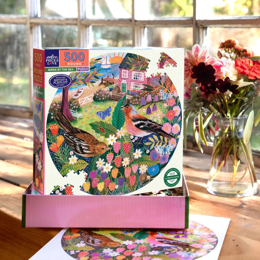 Puslespillet har motiv af to skønne fugle med havet og et sødt lille hus i baggrund. Der er så mange fine detaljer, som du kan nyde mens du samler det.