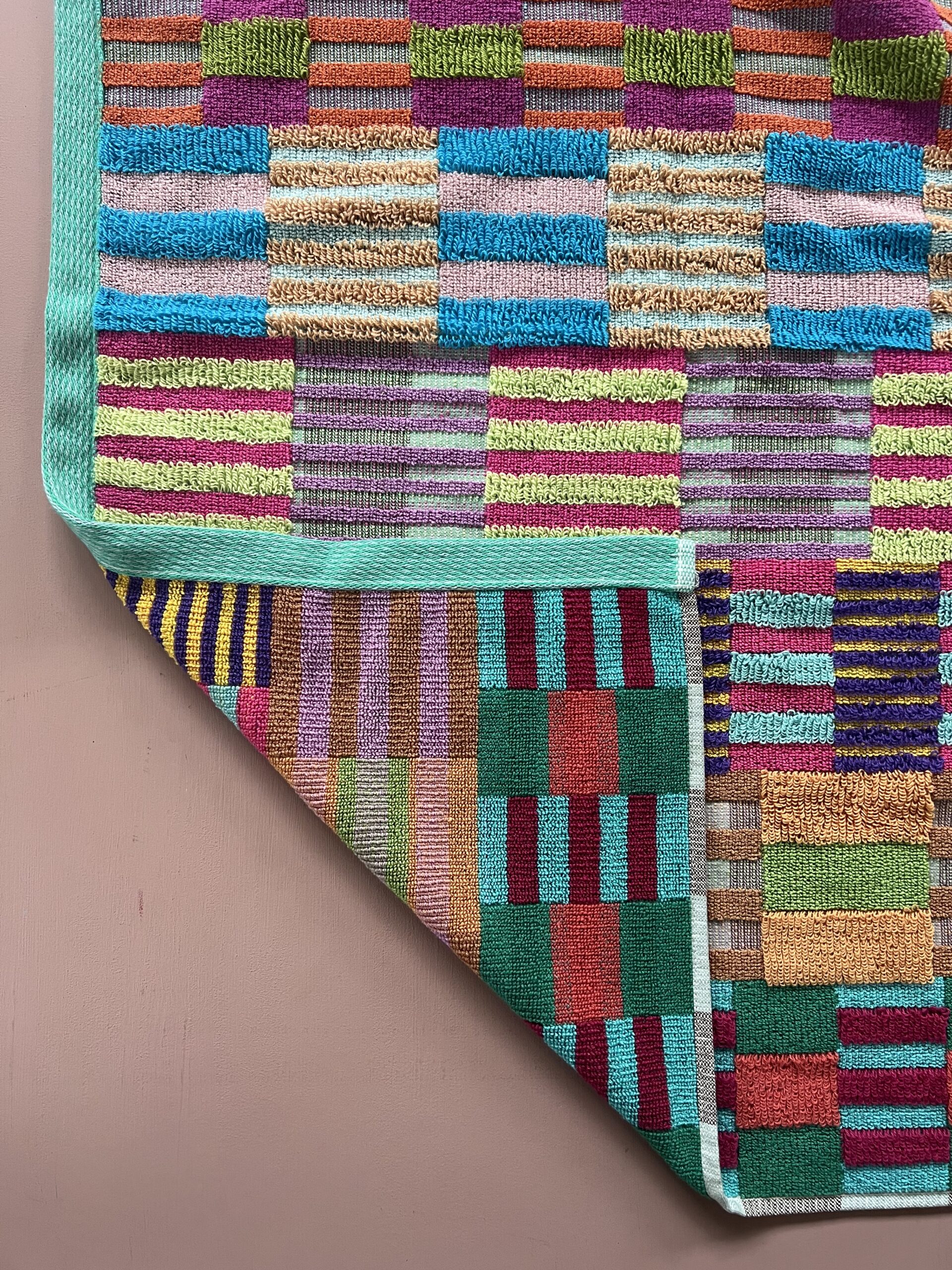 Den er designet af hollandske Foekje Fleur, som laver produkter med bæredygtig omtanke. Dette håndklæde er nemlig lavet af garnrester fra tekstilindustrien. Det er nemlig sådan, at mange fabrikker ofte farver mere garn til produktion af tekstiler, end de har brug for. Desværre ender meget af garnet med slet ikke at blive brugt – men det gør det nu!