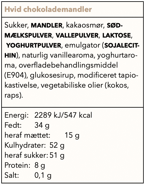 Ingredienser : Sukker, mandler, kakaosmør, sødmælkspulver, vallepulver, laktose, yoghurtpulver, emulgator (sojalecithin), naturlig vanillearoma, yoghurtaroma, overfladebehandlingsmiddel (E904), glukosesirup, modificeret tapiokastivelse, vegetabilske olier (kokos, rasp).