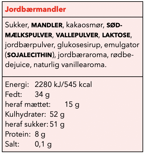 Ingredienser : Sukker, mandler, kakaosmør, sødmælkspulver, vallepulver, laktose, jordbærpulver, glukosesirup, emulgator (sojalecithin), jordbæraroma, rødbedejuice, naturlig vaniljearoma.