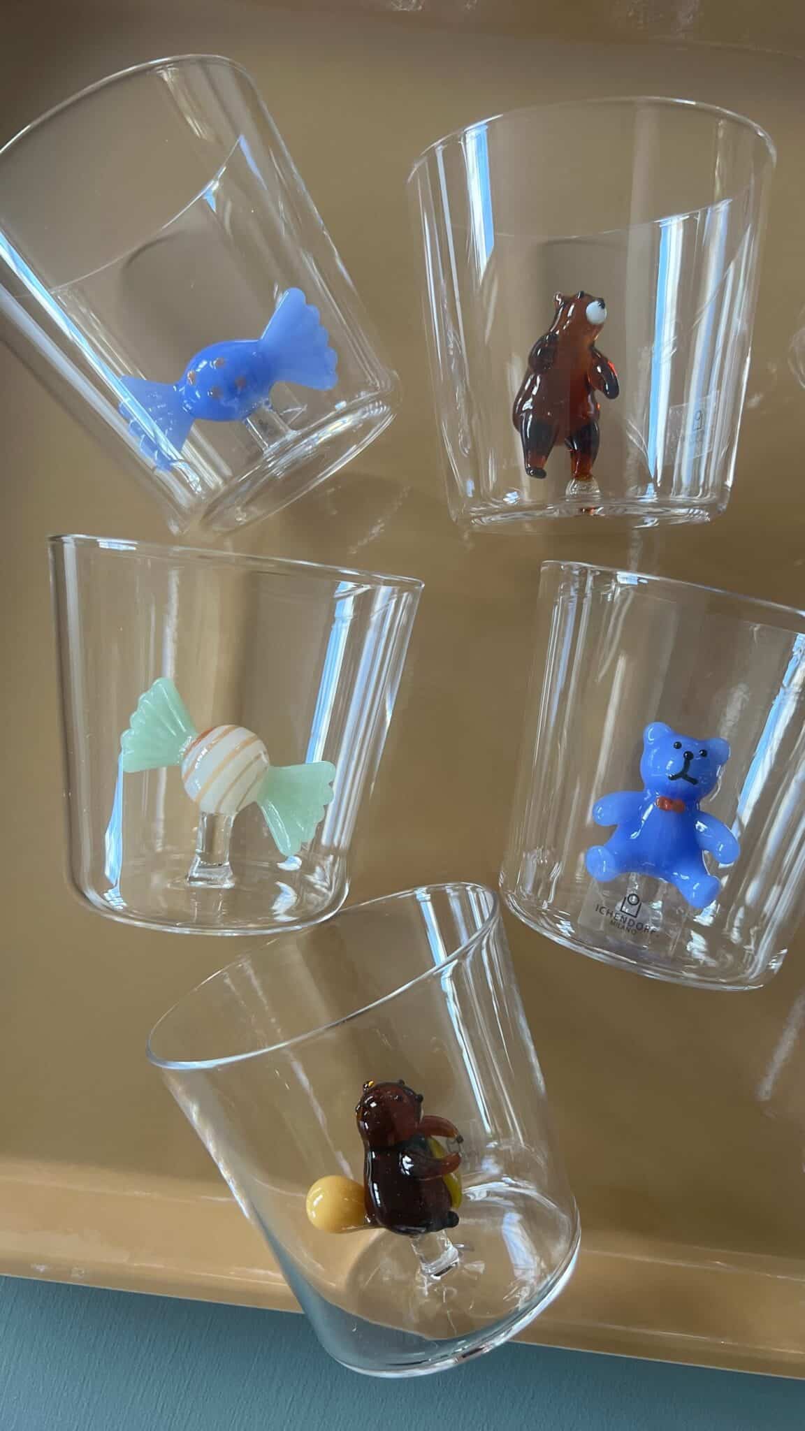 Drikkeglassene er helt enkle og klassiske i formen, men indeni selve glasset er der en blå bamse.