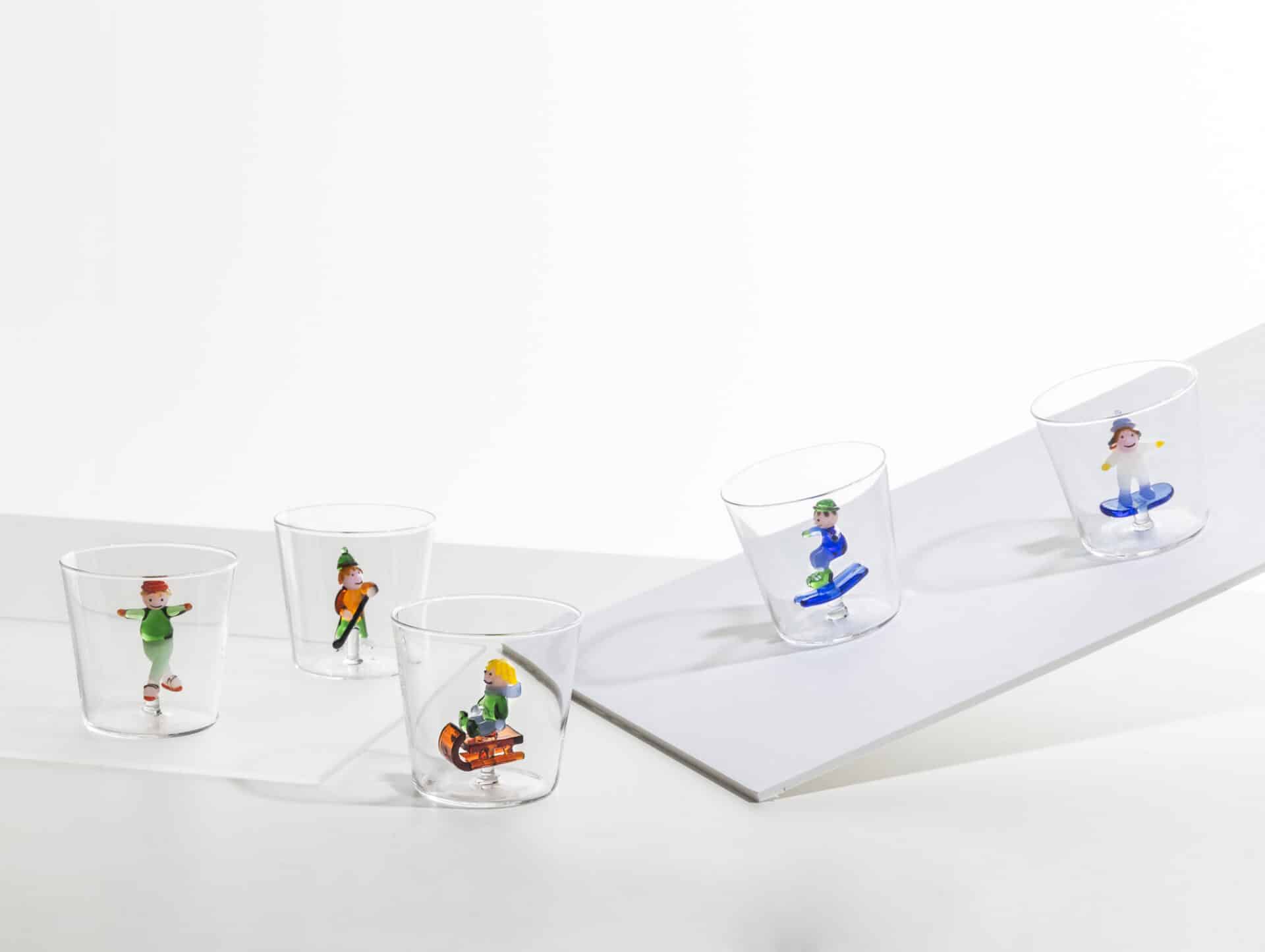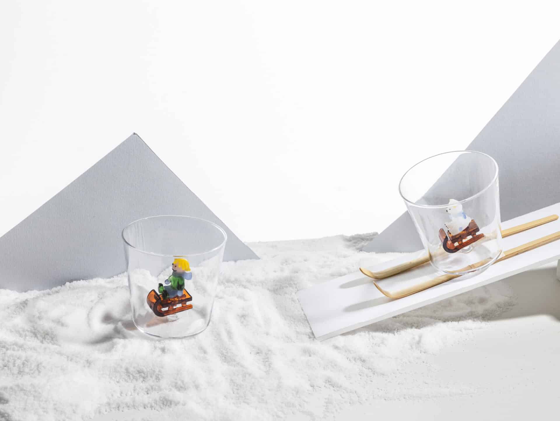 Drikkeglassene er helt enkle og klassiske i formen, men indeni selve glasset er der et barn på en kælk – virkelig skønt detaljeret.