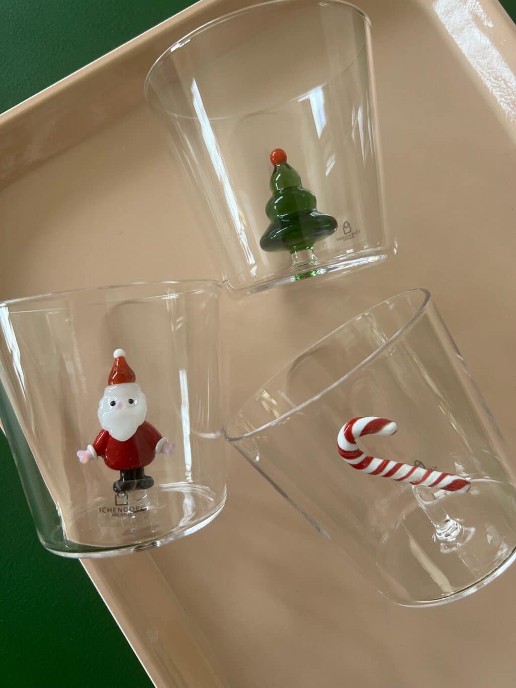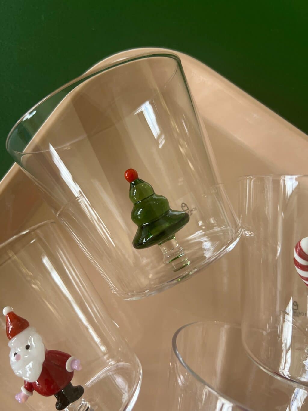 Drikkeglassene er helt enkle og klassiske i formen, men indeni selve glasset er der det fineste juletræ i grønt glas.