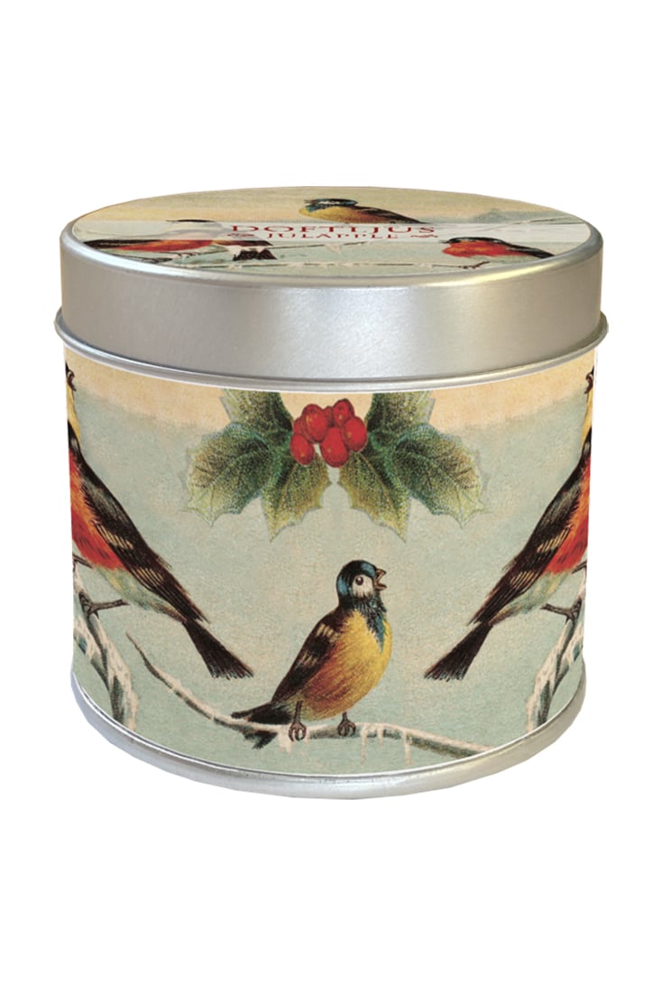 Lad julestemningen flyve ind i hjemmet med dette smukke duftlys i metaldåse, smukt dekoreret med vintage motiv af julefugle, røde bær og sneklædte grene.