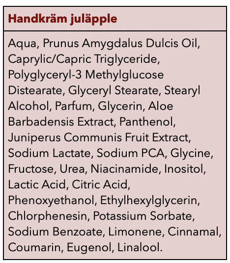 Ingredienser : Aqua, Prunus Amygdalus Dulcis Oil, Caprylic/Capric Triglyceride, Polyglyceryl-3 Methylglucose Distearate, Glyceryl Stearate, Stearyl Alcohol, Parfum, Glycerin, Aloe Barbadensis Extract, Panthenol, Juniperus Communis Fruit Extract, Sodium Lactate, Sodium PCA, Glycine, Fructose, Urea, Niacinamide, Inositol, Lactic Acid, Citric Acid, Phenoxyethanol, Inositol, Lactic Acid, Citric Acid, Ethylhexylglycerin, Chlorphenesin, Potassium Sorbate, Sodium Benzoate, Limonene, Cinnamal, Coumarin, Eugenol, Linalool.