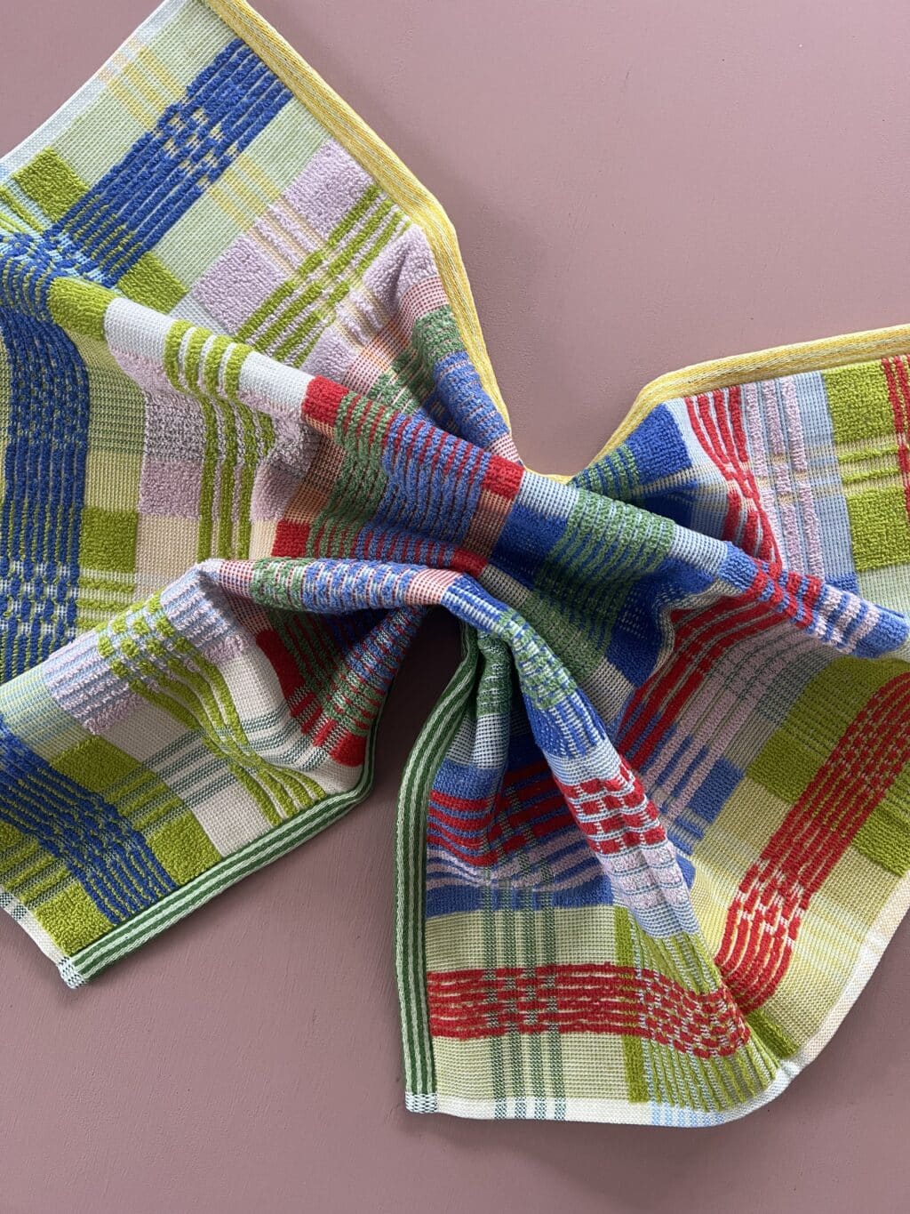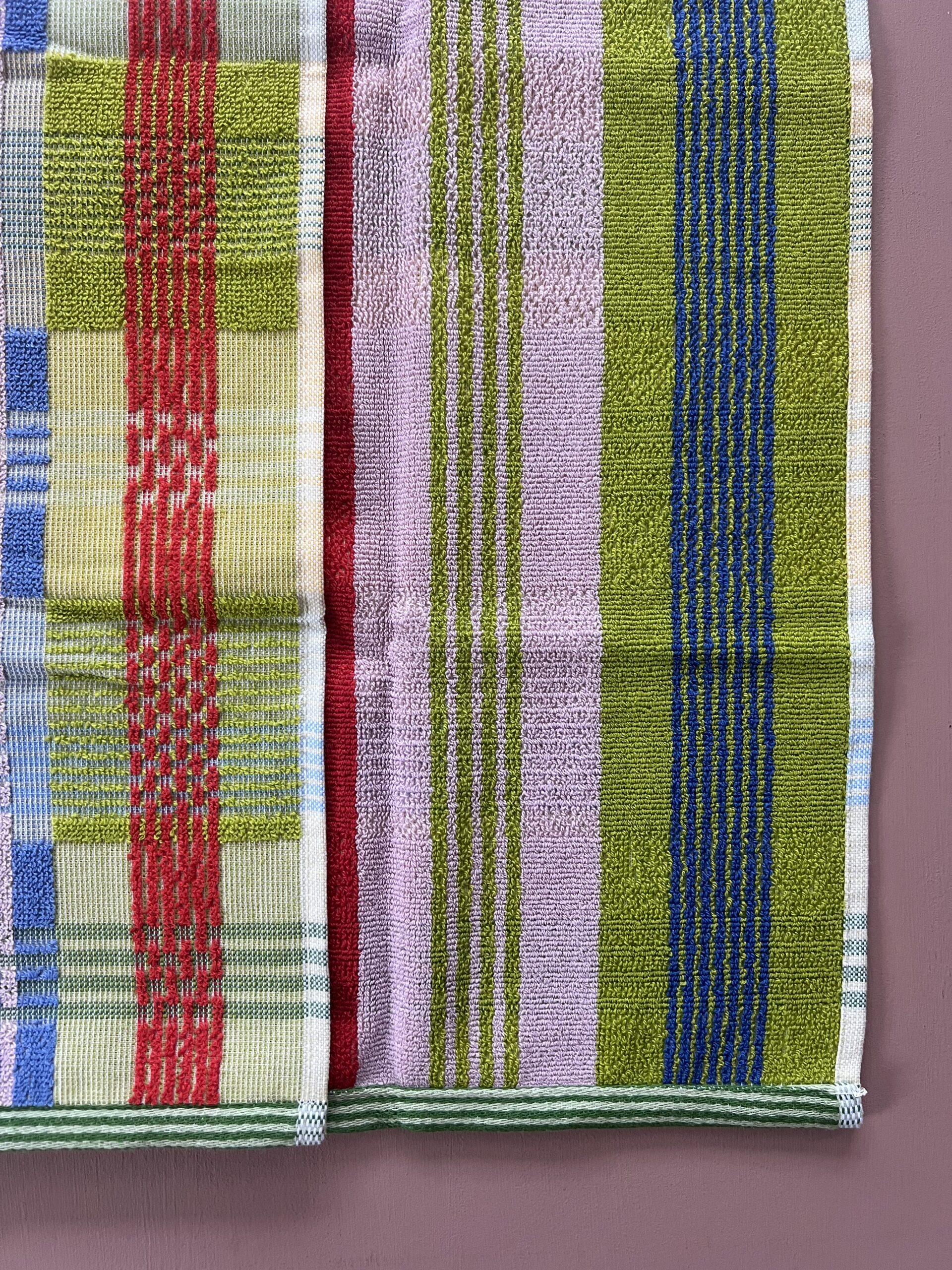 Håndklædets design hedder “wild weave”, hvilket referere til den oprindelige vævnings-process. I dette design væves de mange forskellige tråde og farver sammen på en unik og interessant måde, hvilket skaber det fineste mønster med både striber og tern.