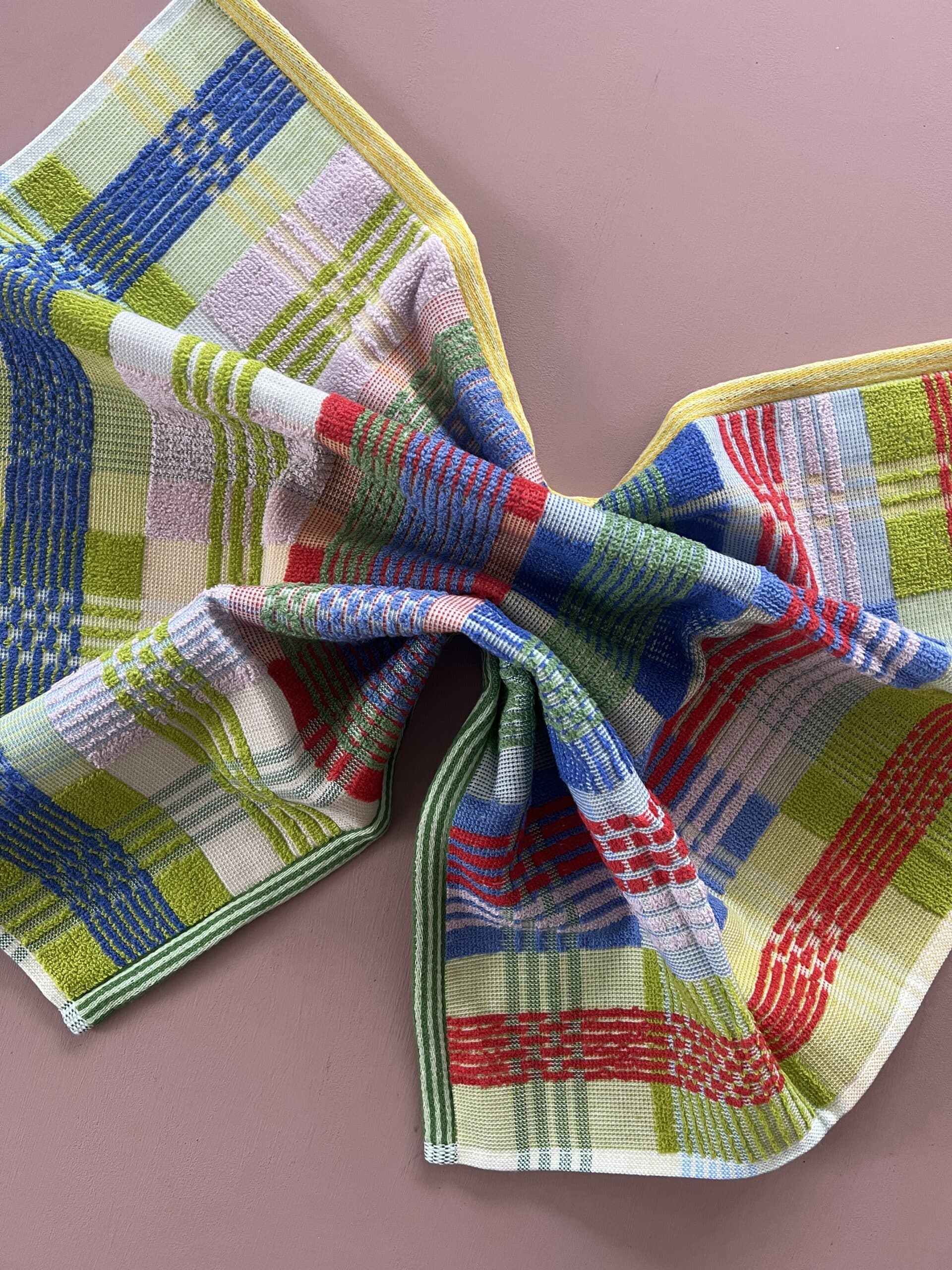 Alle de skønne farverige varer i Odds & Ends-serien er nemlig lavet af garnrester. Garnrester, der nu har fået nyt liv og er endt ud som de smukkeste tekstiler, som blandt det her håndklæde. Det betyder også, at det ikke er sikkert at lige netop dette design produceres igen, da produktionen afhænger udelukkende af hvilke garnrester der er.