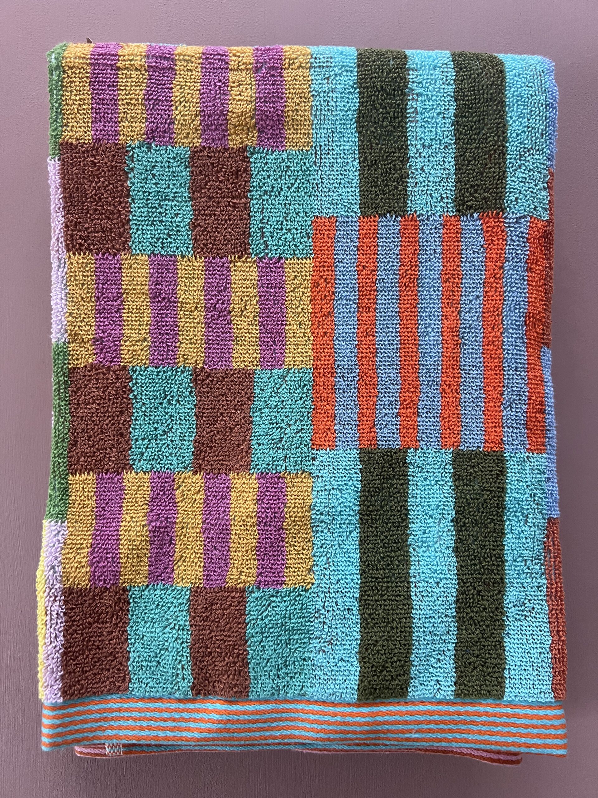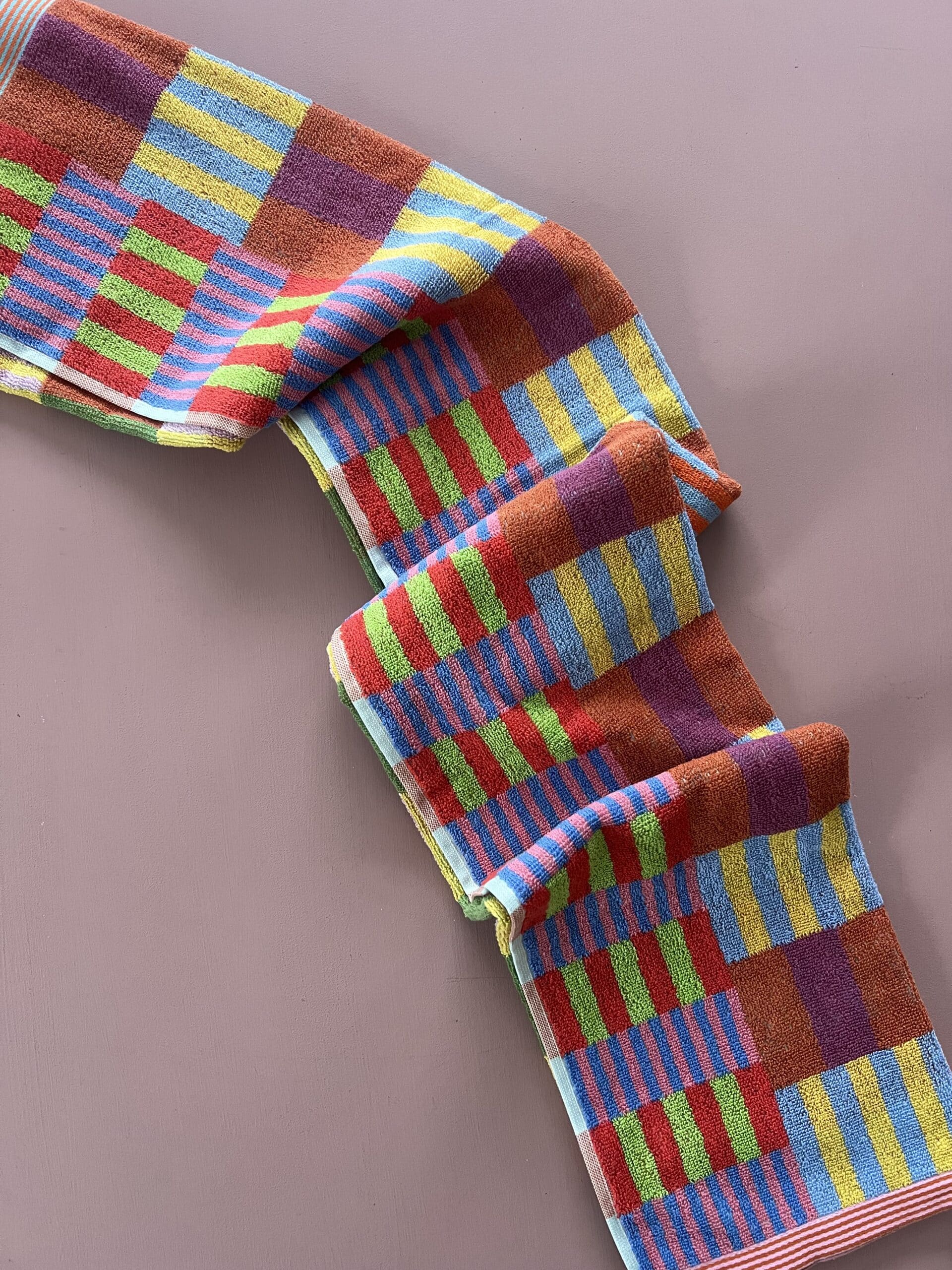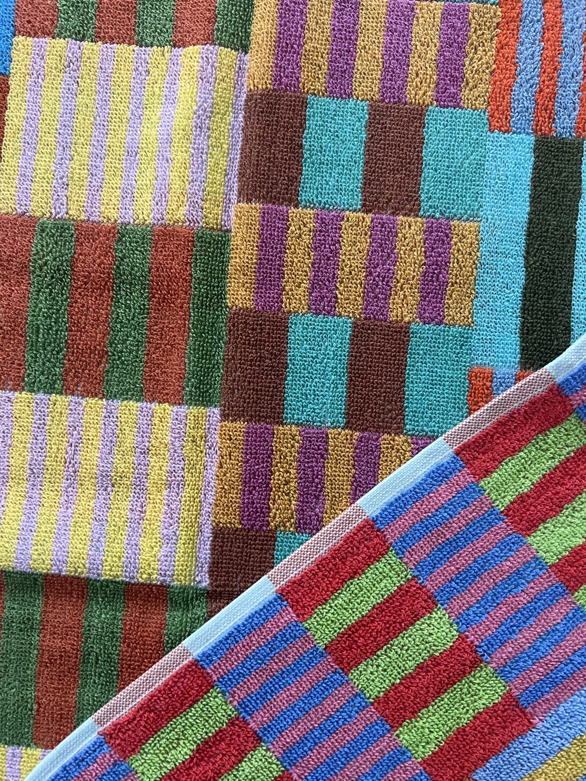 Håndklædets farverige mønster dannes når de mange forskellige farvede tråde væves over hinanden – et design som er overraskende, harmonisk og helt specielt.