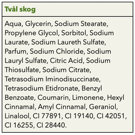Ingredienser : Aqua, Glycerin, Sodium Stearate, Propylene Glycol, Sorbitol, Sodium Laurate, Sodium Laureth Sulfate, Parfum, Sodium Chloride, Sodium Lauryl Sulfate, Citric Acid, Sodium Thiosulfate, Sodium Citrate, Tetrasodium Iminodisuccinate, Tetrasodium Etidronate, Benzyl Benzonate, Coumarin, Limonene, Hexyl Cinnamal, Amyl Cinnamal, Geraniol, Linalool, CI 77891, CI 19140, CI 42051, CI 16255, CI 28440