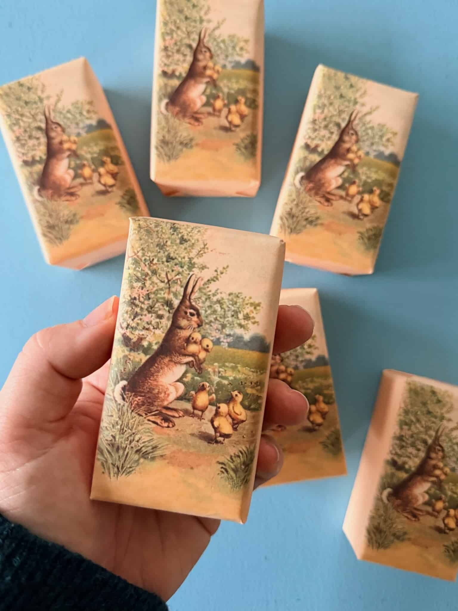 Sæben er smukt indpakket i papir med motiv af en påskehare og kyllinger.