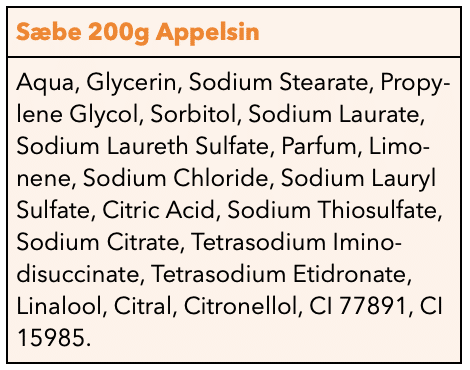 Ingredienser : Aqua, Glycerin, Sodium Stearate, Propylene Glycol, Sorbitol, Sodium Laurate, Sodium Laureth Sulfate, Parfum, Limonene, Sodium Chloride, Sodium Lauryl Sulfate, Citric Acid, Sodium Thiosulfate, Sodium Citrate, Tetrasodium Iminodisuccinate, Tetrasodium Etidronate, Linalool, Citral, Citronellol, CI 77891, CI 15985