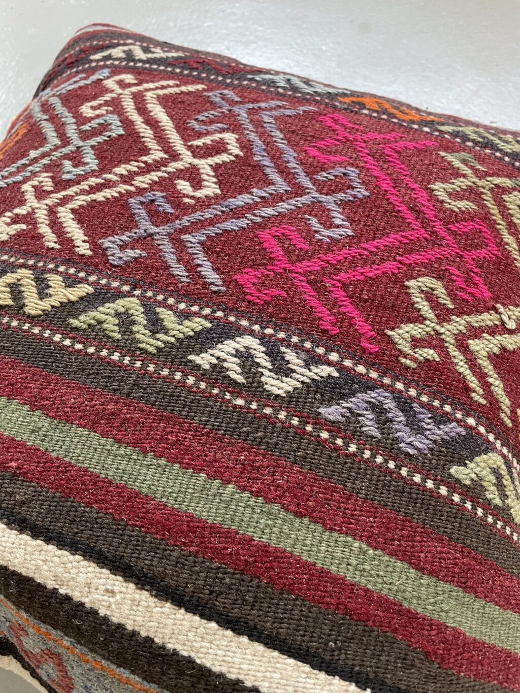 Vi har fundet en bunke smukke vintage puder, syet op af gamle kelimtæpper – hver pude er unika, så du får præcis den pude du ser her på billedet.