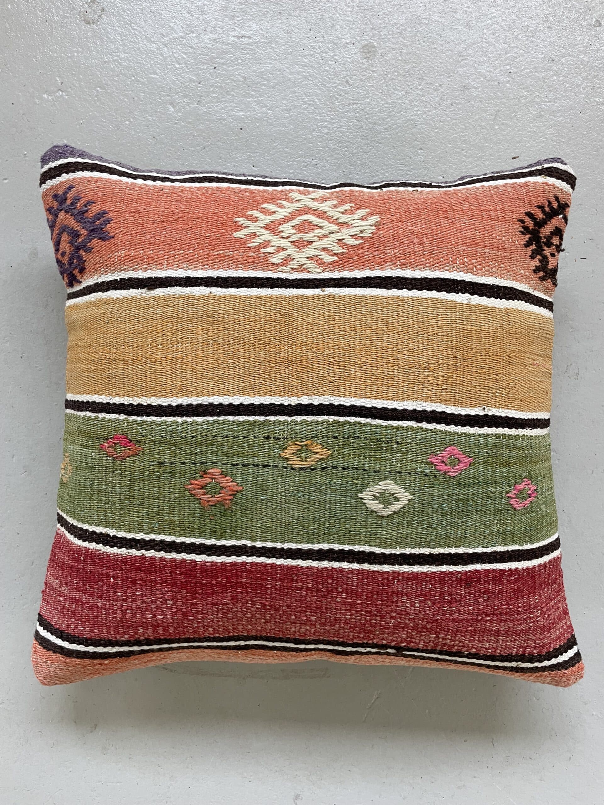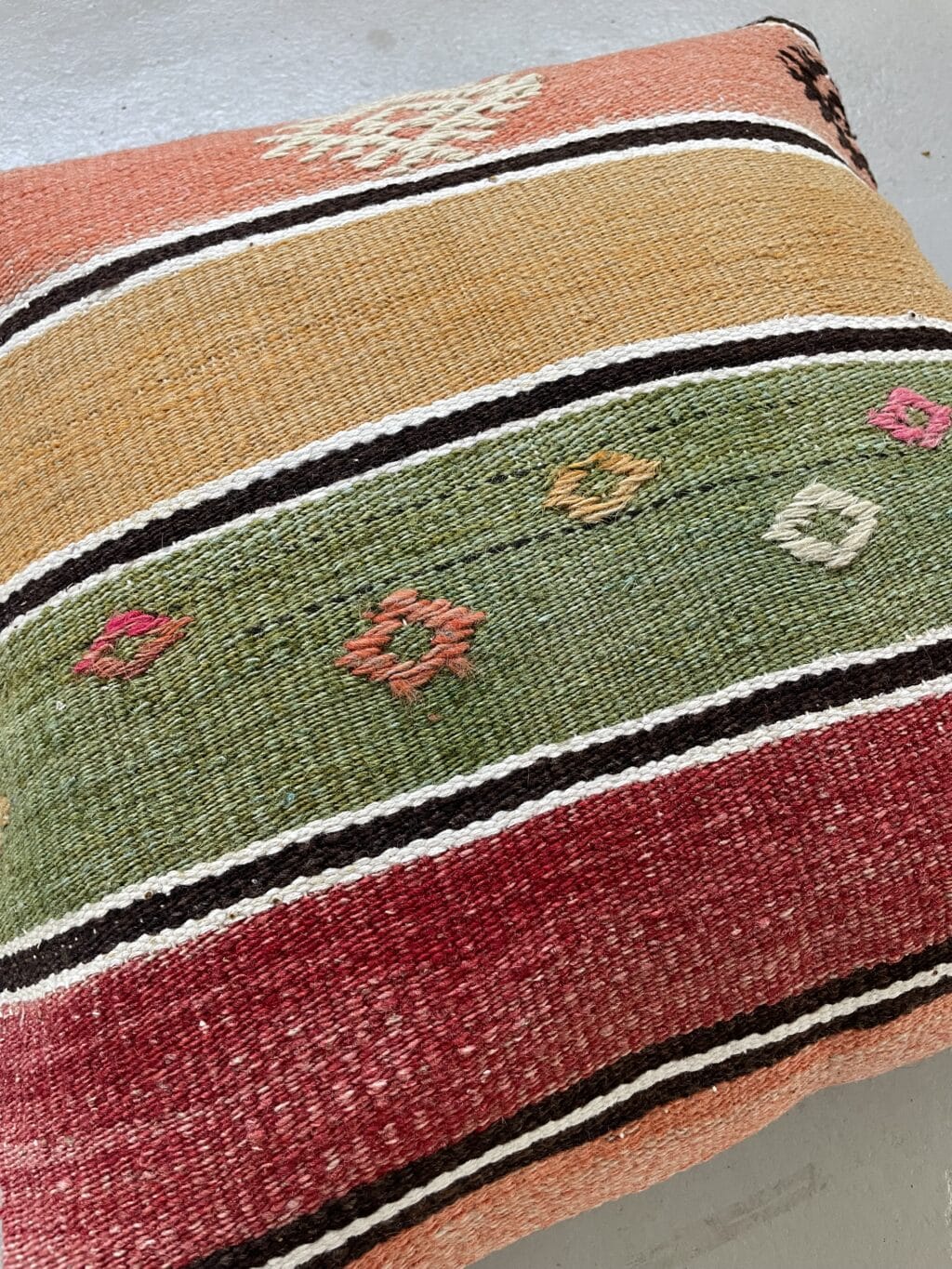 Alle kelimpuderne er syet af vintage kelimtæpper, det betyder at du ikke finder 2 puder som er helt ens – de er alle forskellige i størrelse, farver og mønster – det synes vi er så fint.