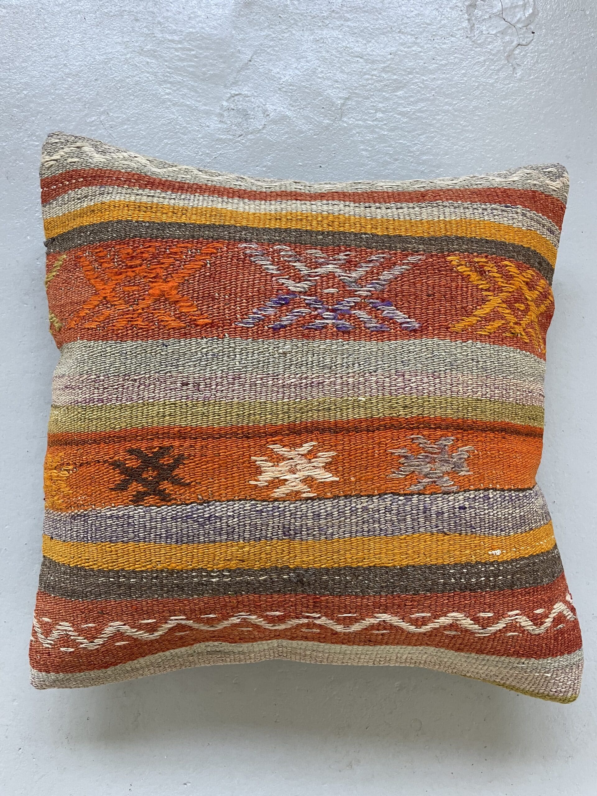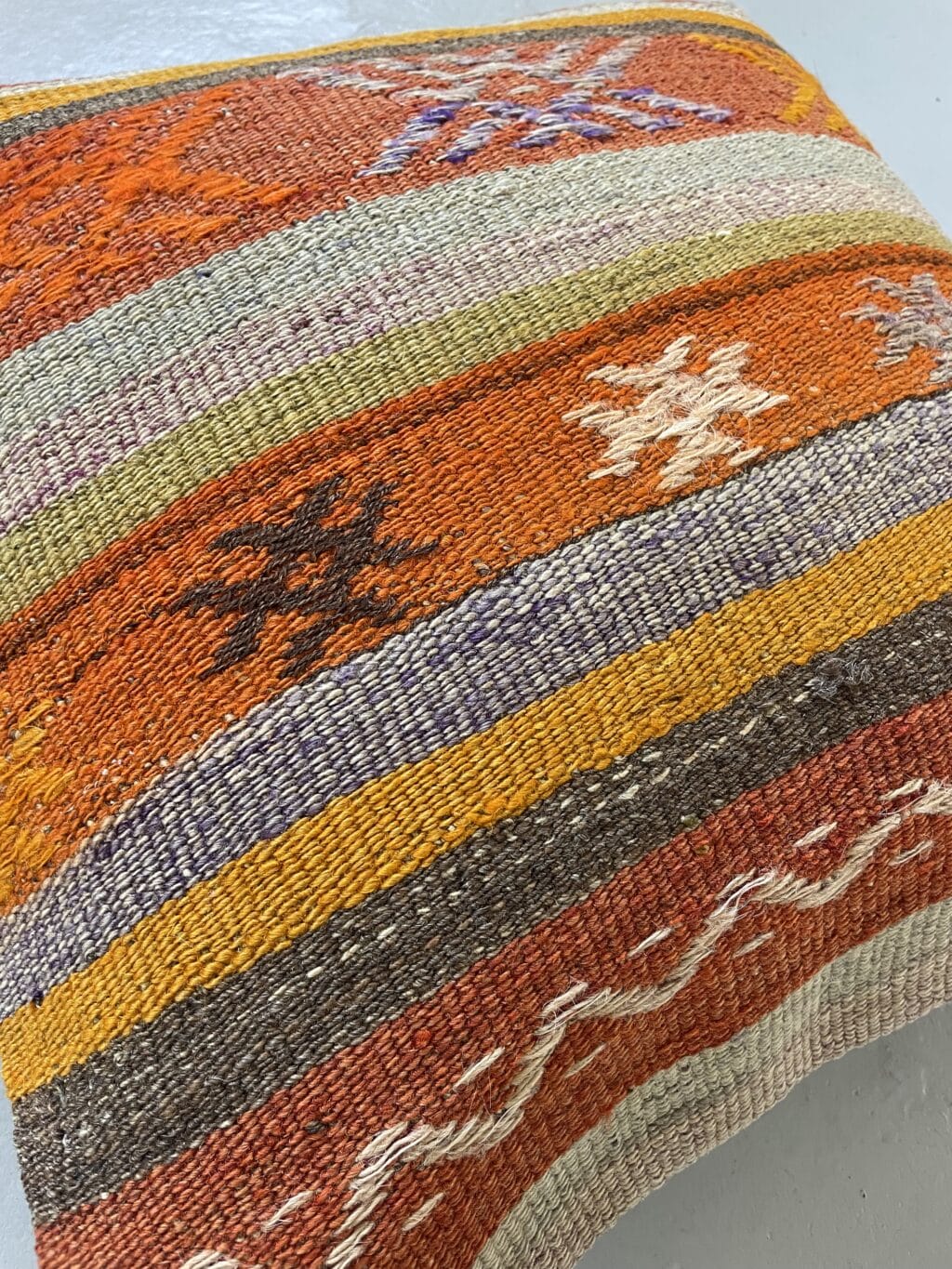 Alle vores kelimpuder er syet af vintage kelimtæpper fra Tyrkiet – det gør, at alle puderne er unikke og du finder altså ikke 2 puder som er 100% ens.