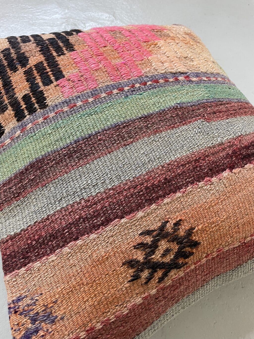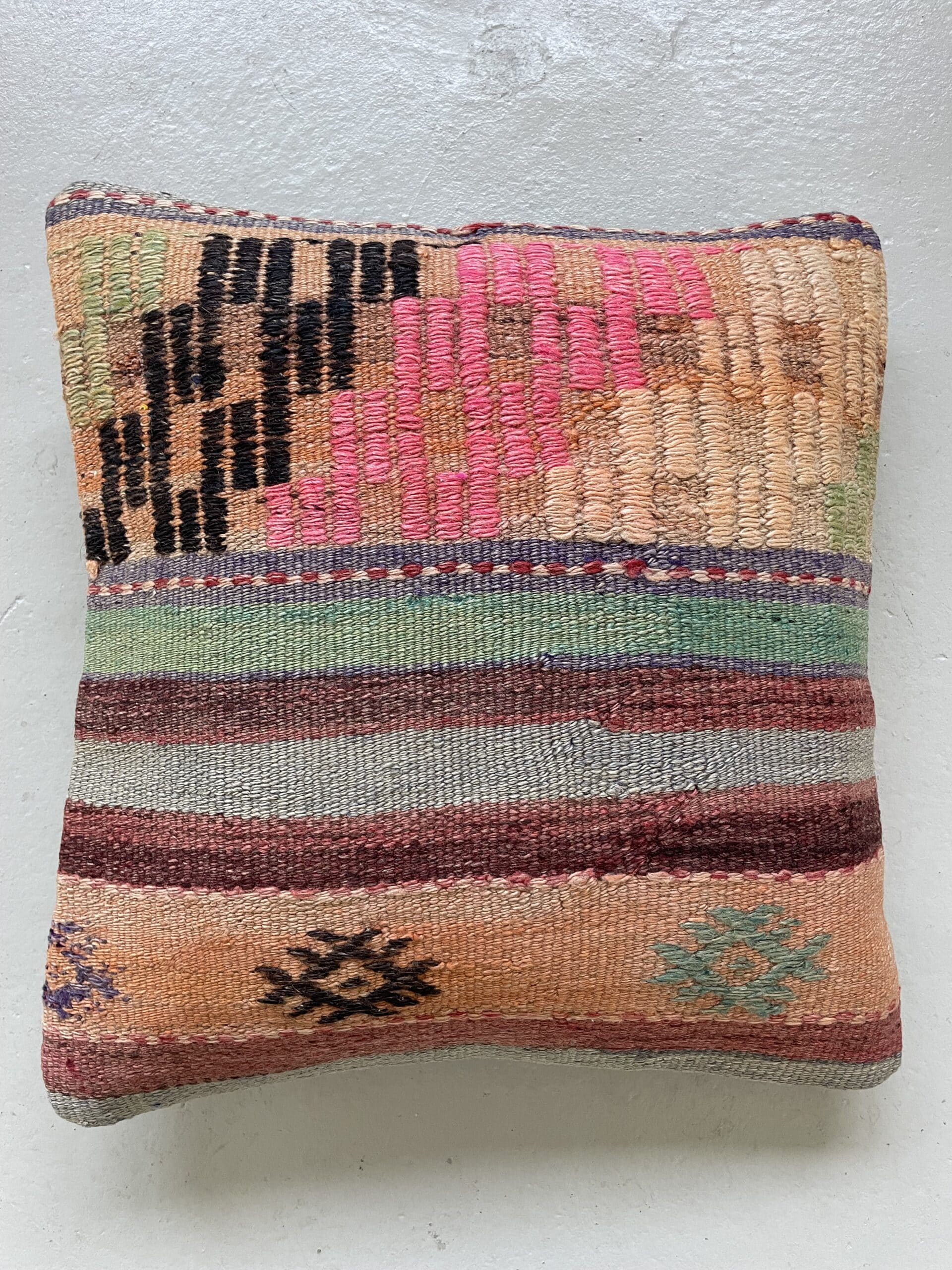 Vi har fundet en bunke smukke vintage puder, syet op af gamle kelimtæpper – hver pude er unika, så du får præcis den pude du ser her på billedet.