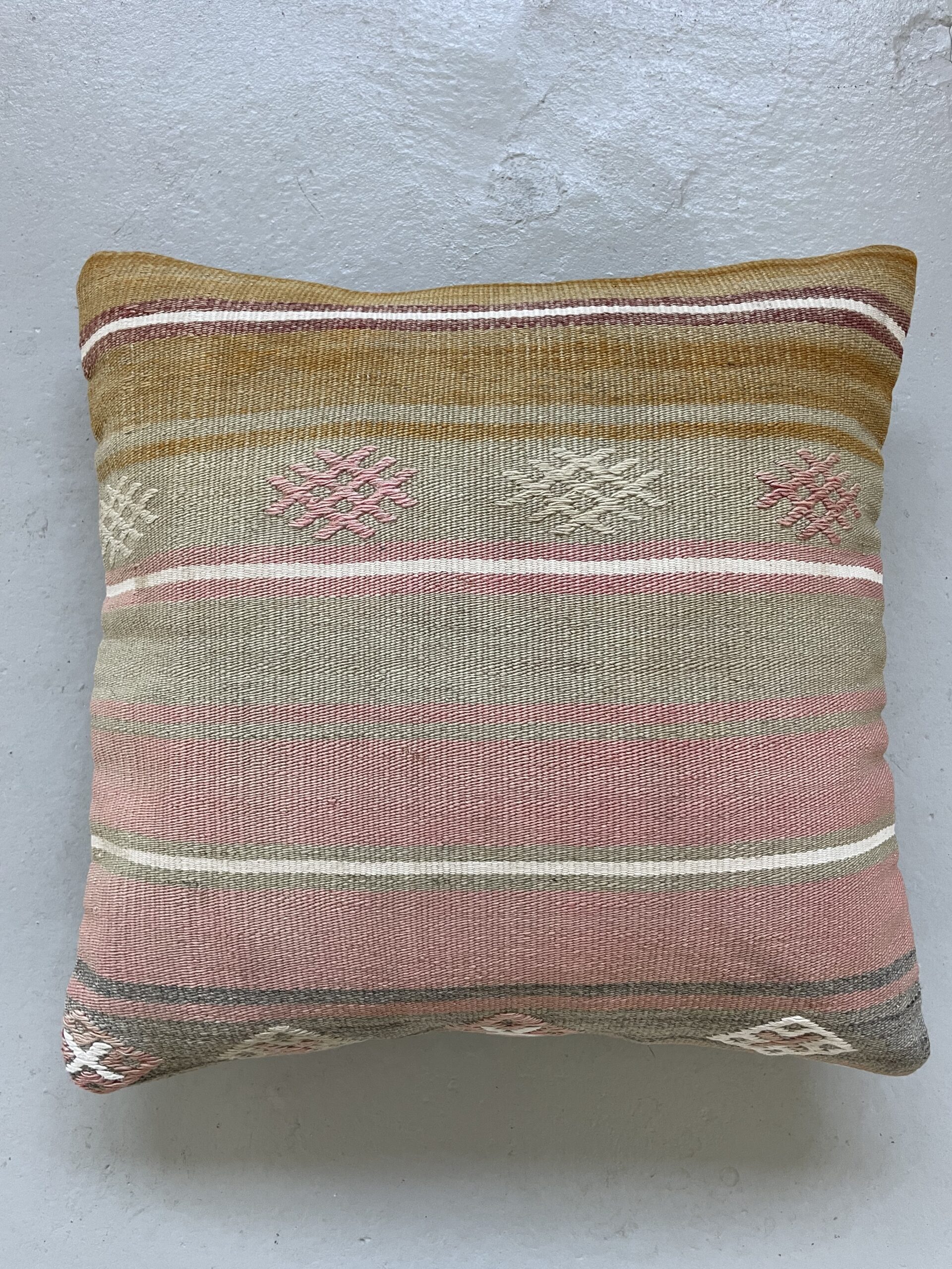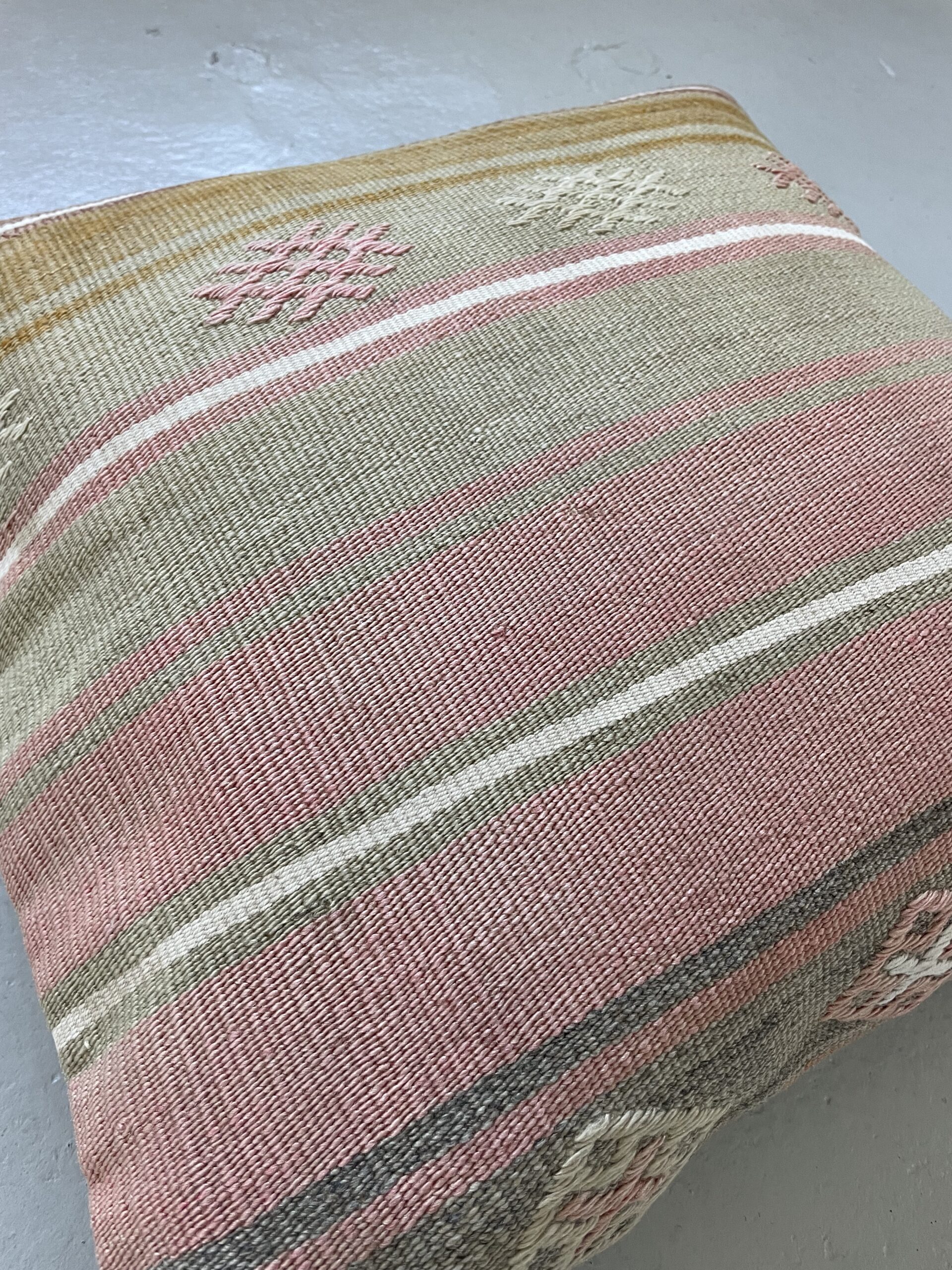 Vi har fundet en bunke smukke vintage puder, syet op af gamle kelimtæpper – hver pude er unika, så du får præcis den pude du ser her på billedet.