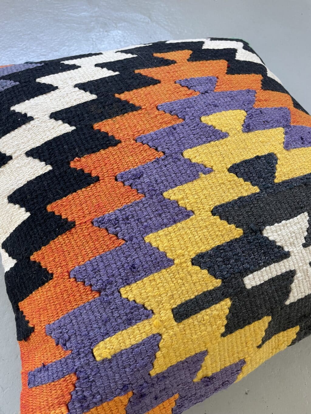 Alle vores kelimpuder er syet af vintage kelimtæpper fra Tyrkiet – det gør, at alle puderne er unikke og du finder altså ikke 2 puder som er 100% ens.