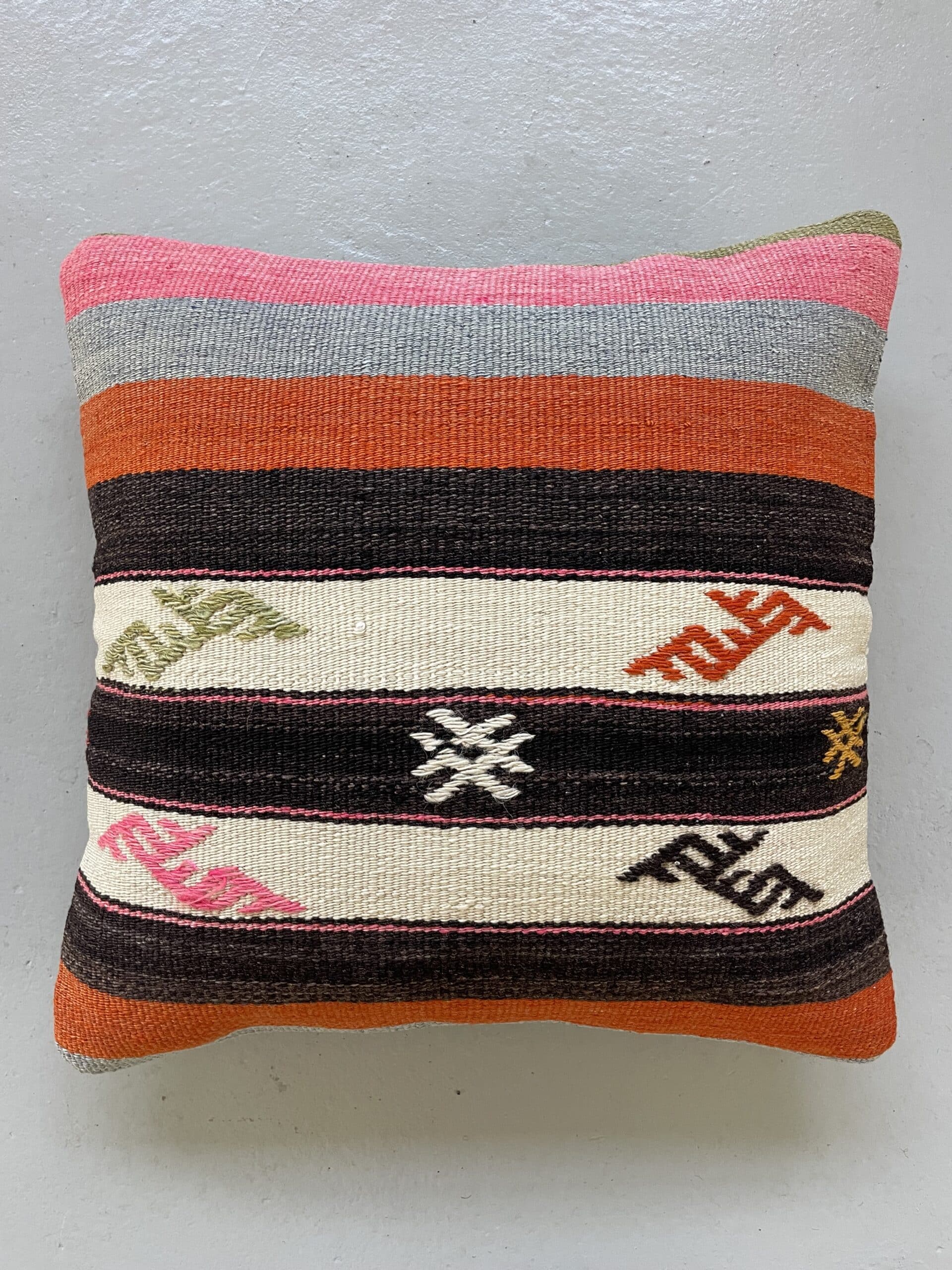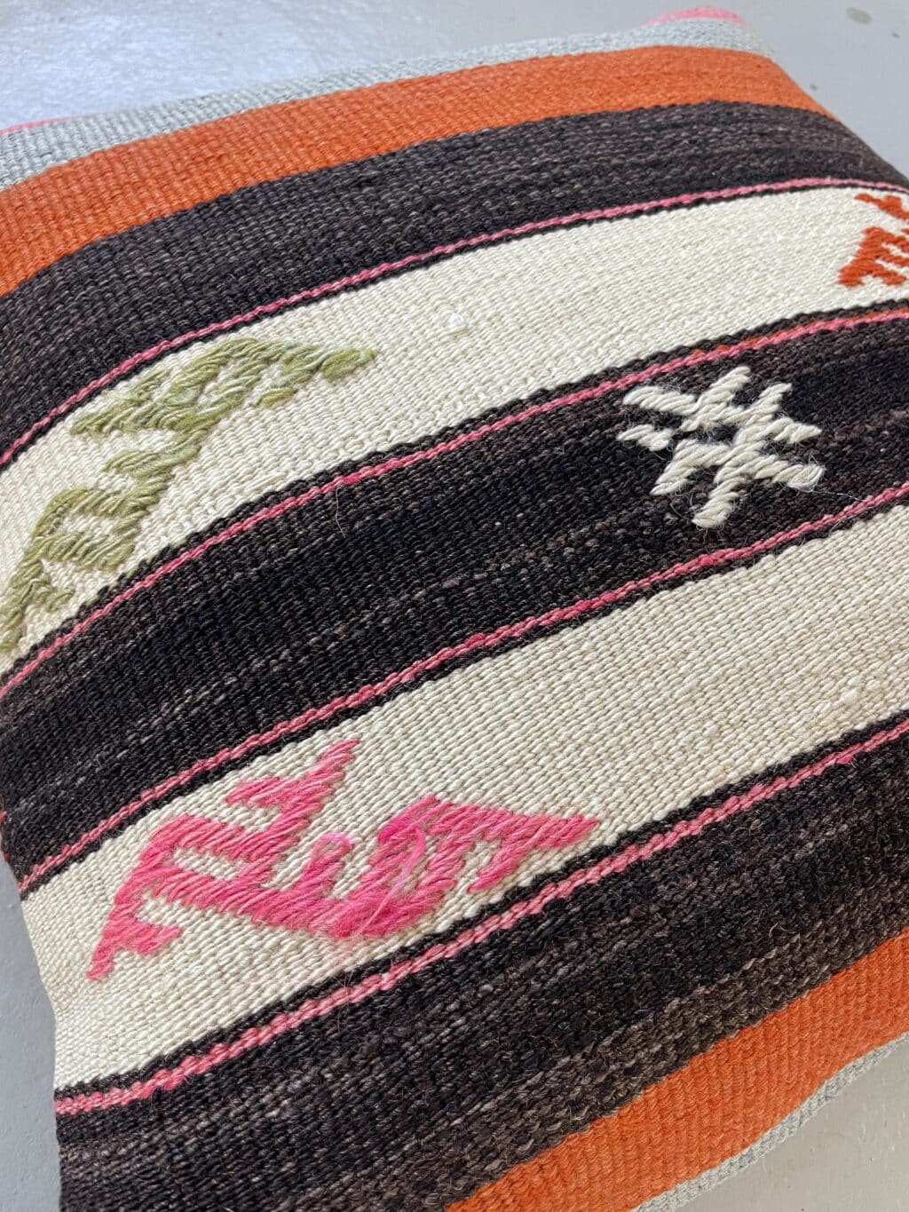 Vi har fundet en bunke smukke vintage puder, syet op af gamle kelimtæpper – hver pude er unika, så du får præcis den pude du ser her på billedet.