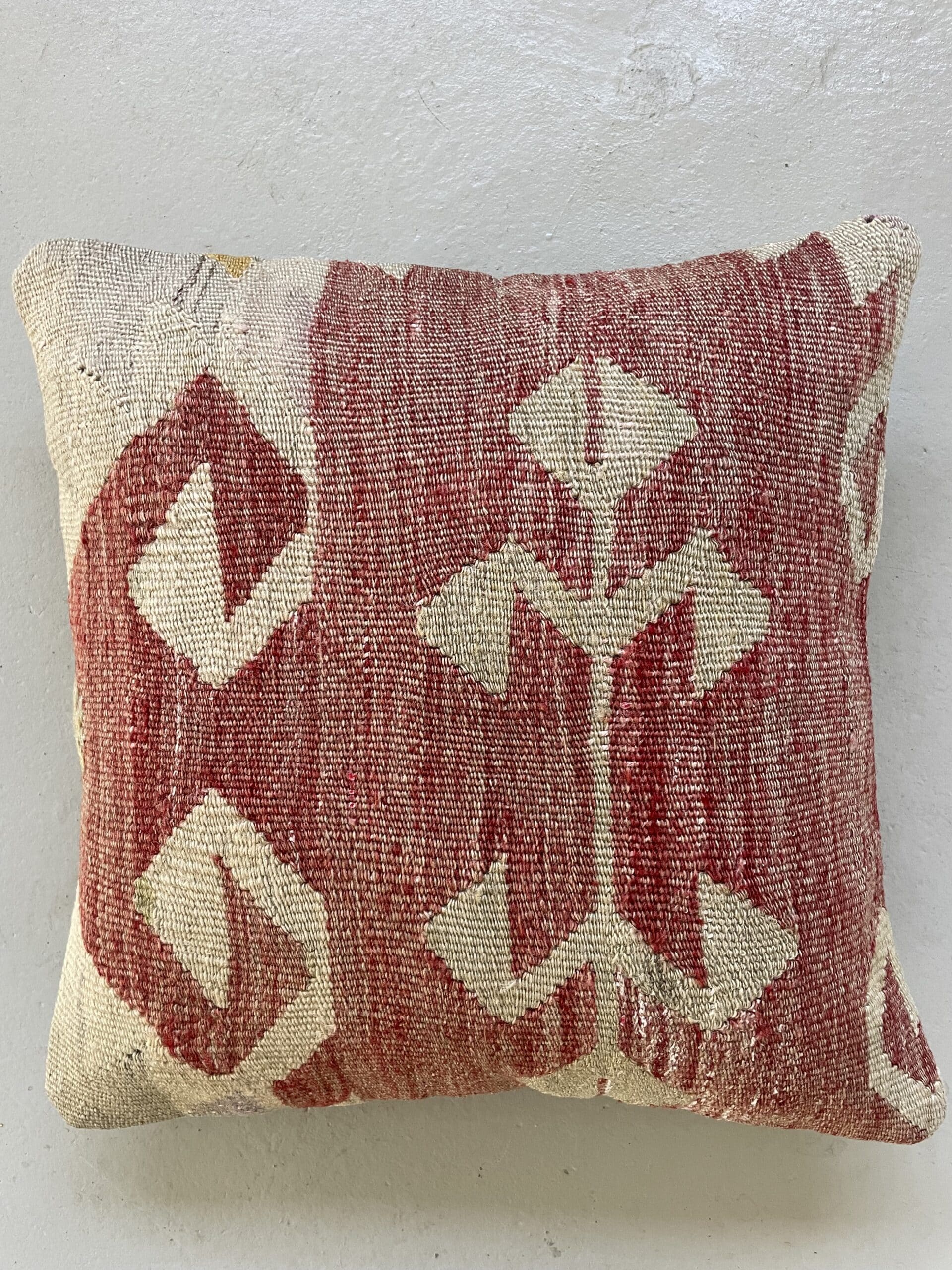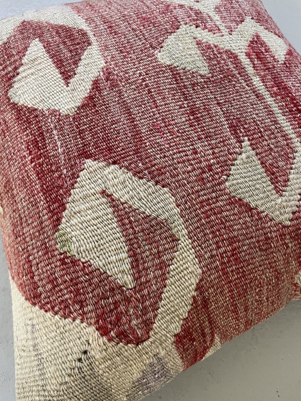 Vi har fundet en bunke smukke vintage puder, syet op af gamle kelimtæpper – hver pude er unika, så du får præcis den pude du ser her på billedet.