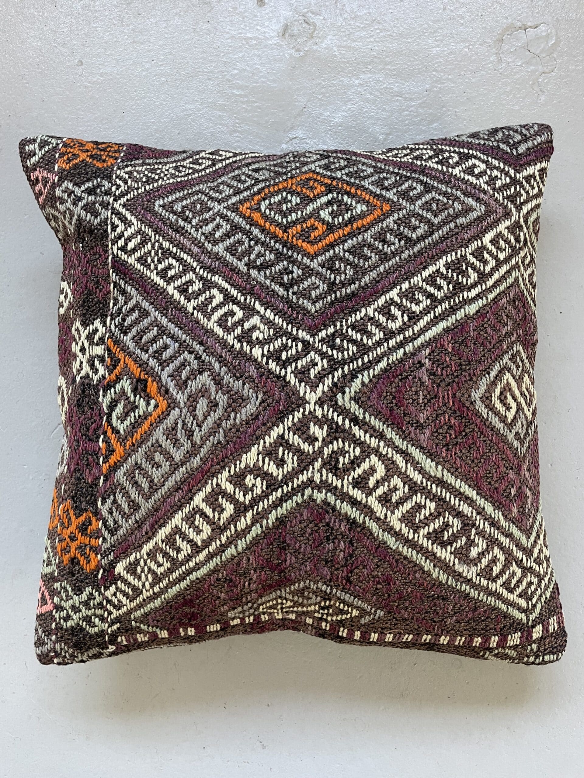 Vi har fundet en bunke smukke vintage puder, syet op af gamle kelimtæpper – hver pude er unika, så du får præcis den pude du ser her på billedet.
