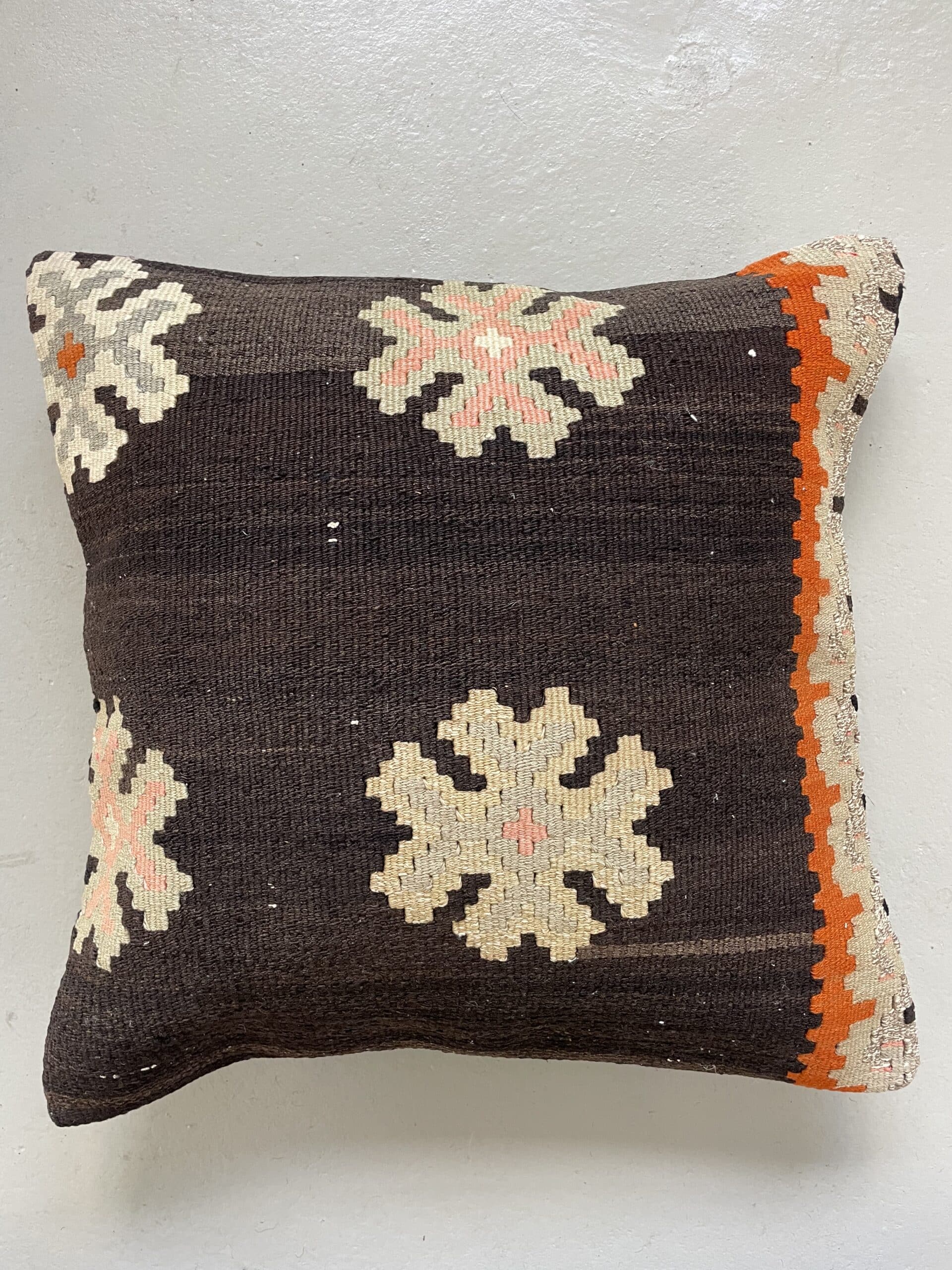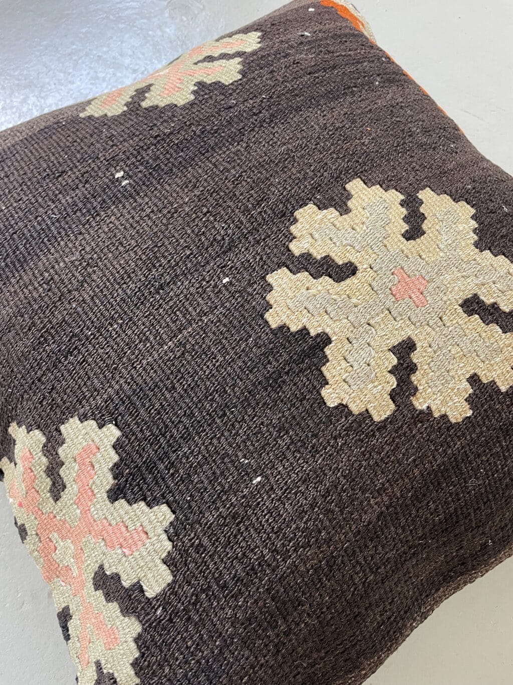 Vi har fundet en bunke smukke vintage puder, syet op af gamle kelimtæpper – hver pude er unika, så du får præcis den pude du ser her på billedet.