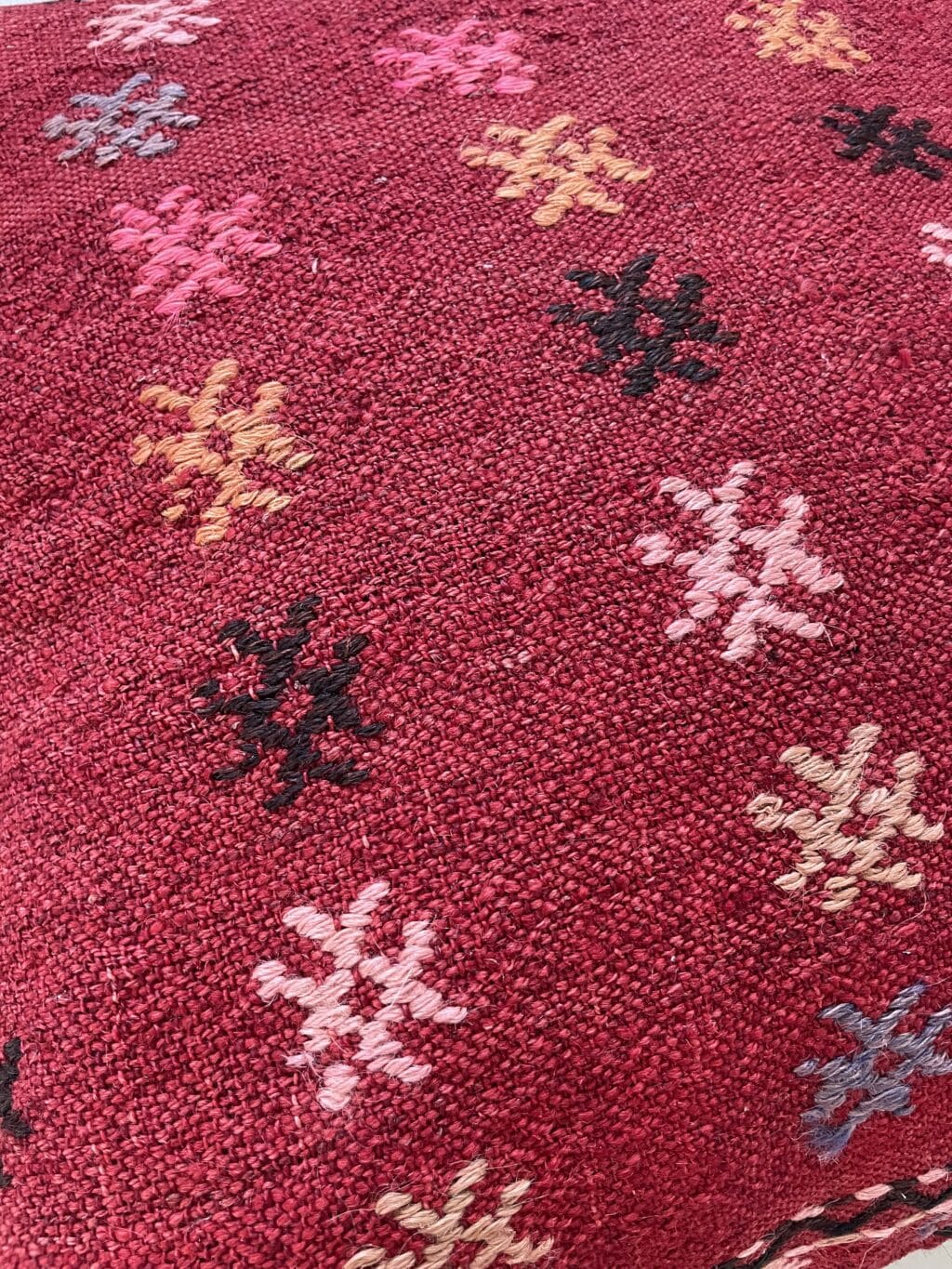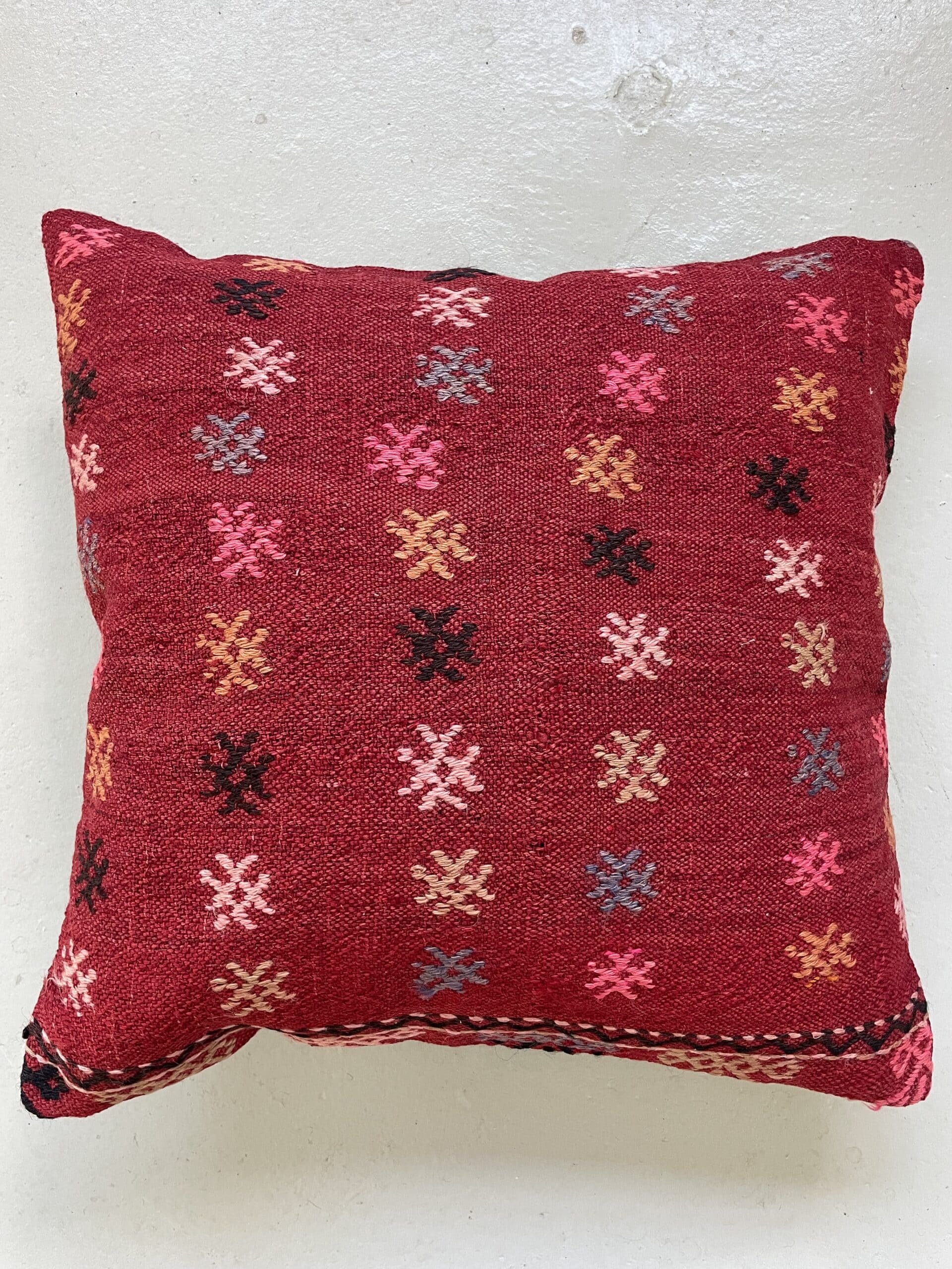 Skønneste røde kelimpude med et helt særligt mønster.