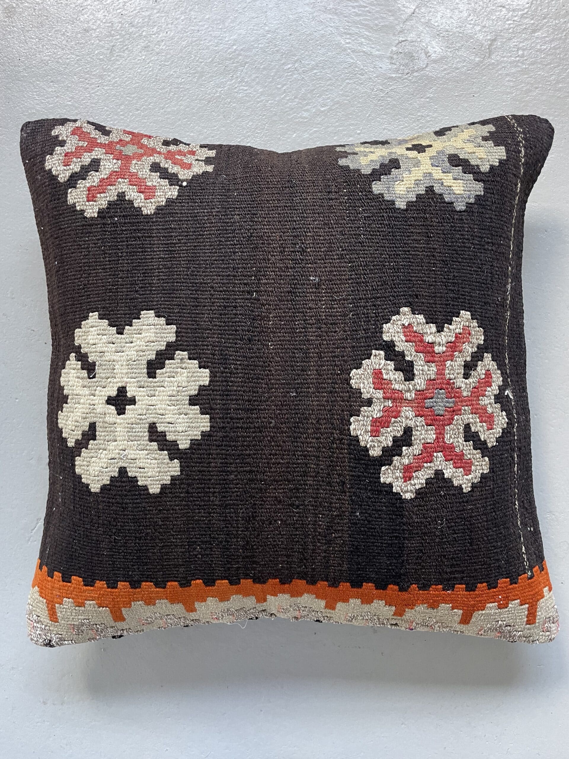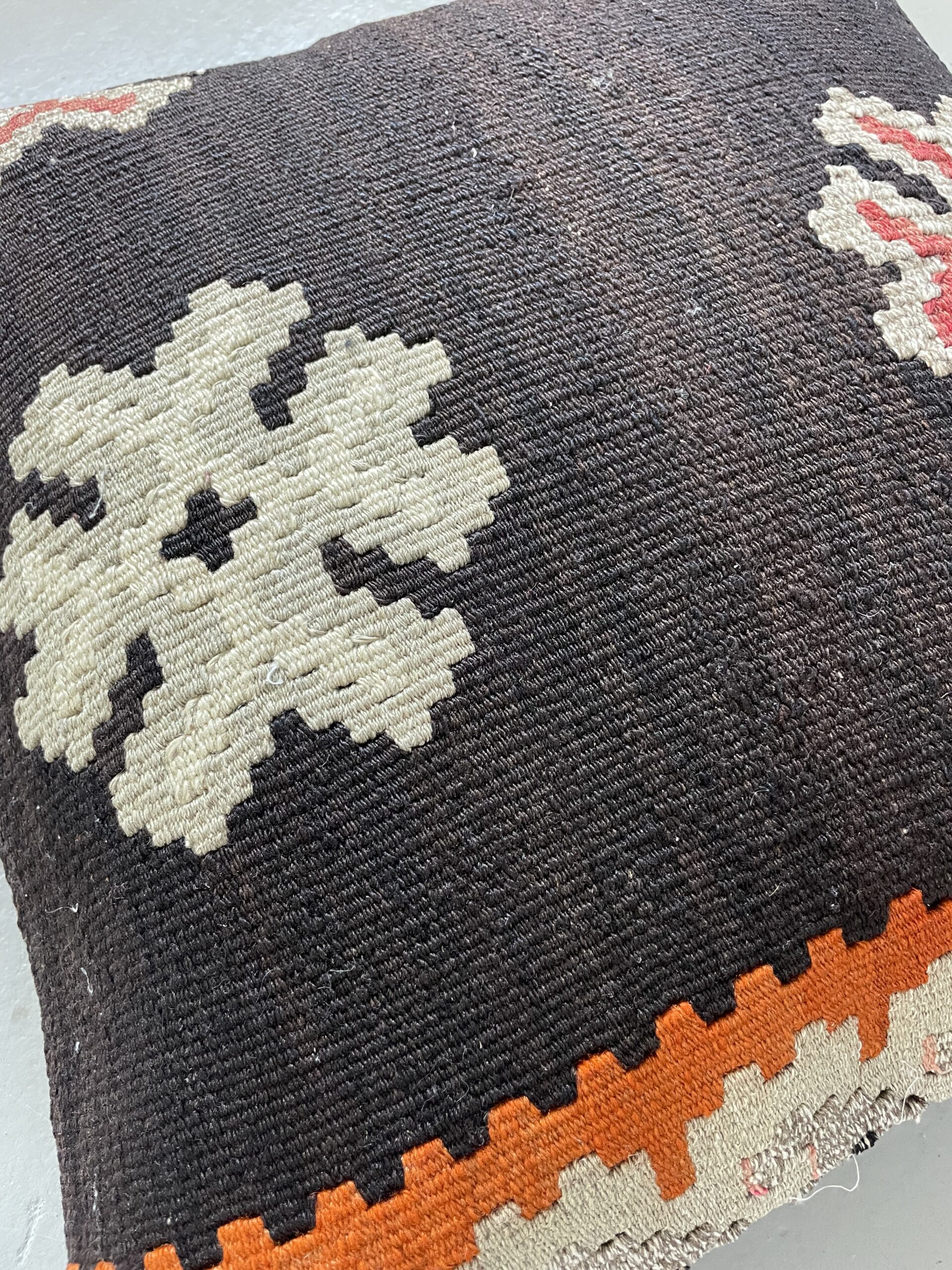 Vi har fundet en bunke smukke vintage puder, syet op af gamle kelimtæpper – hver pude er unika, så du får præcis den pude du ser her på billedet.