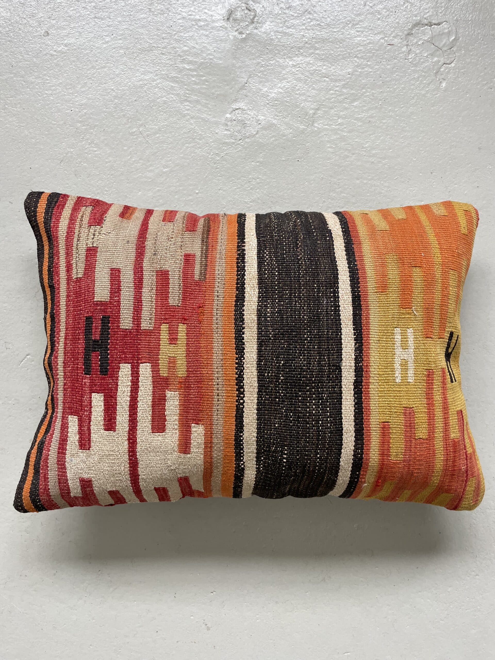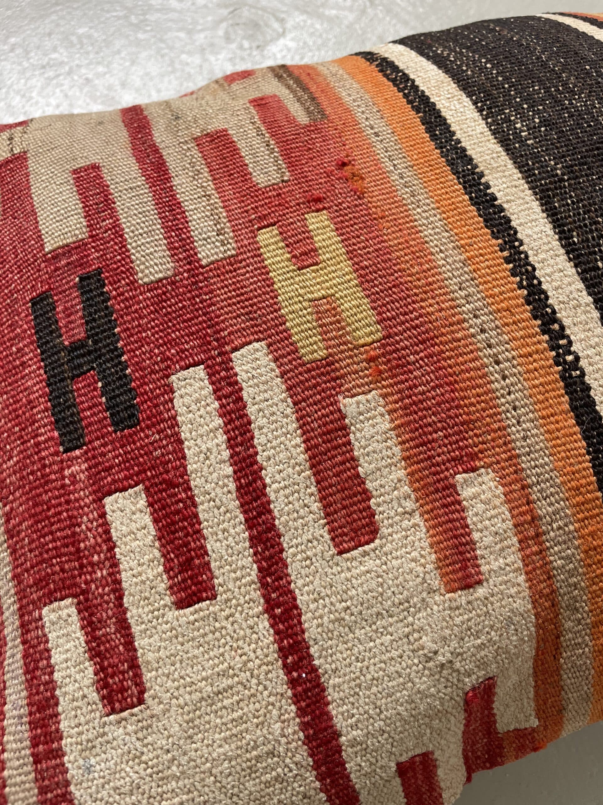 Vi har fundet en bunke smukke vintage puder, syet op af gamle kelimtæpper – hver pude er unika, så du får præcis den pude du ser her på billedet.
