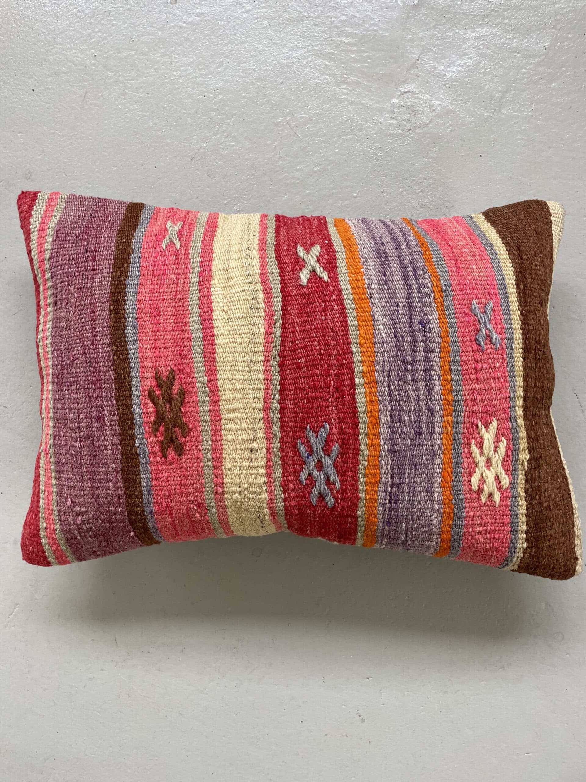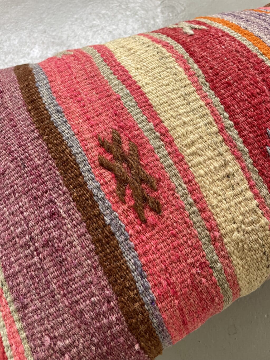 Vi har fundet en bunke smukke vintage puder, syet op af gamle kelimtæpper – hver pude er unika, så du får præcis den pude du ser her på billedet.