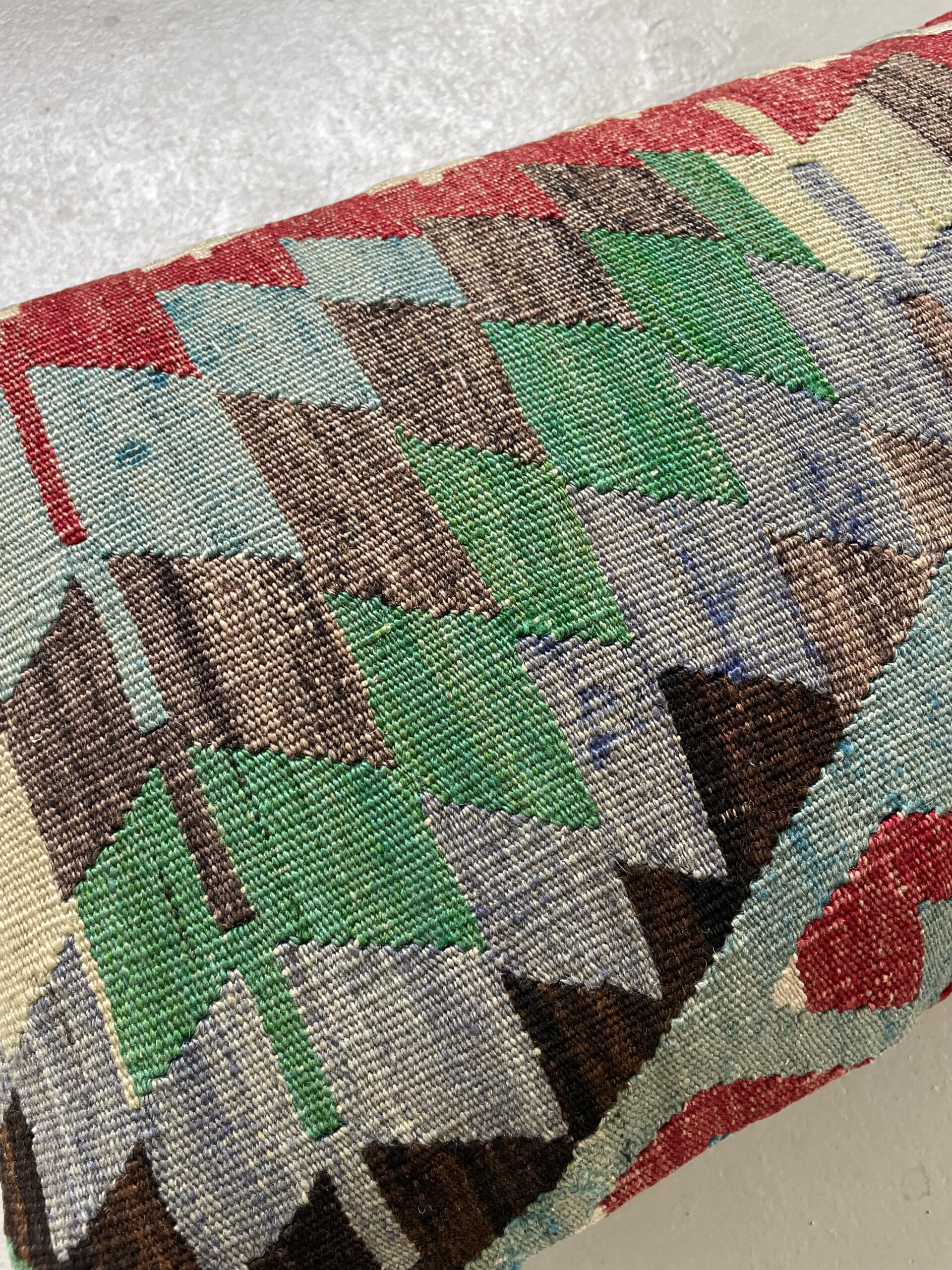 Vi har fundet en bunke smukke vintage puder, syet op af gamle kelimtæpper – hver pude er unika, så du får præcis den pude du ser her på billedet.