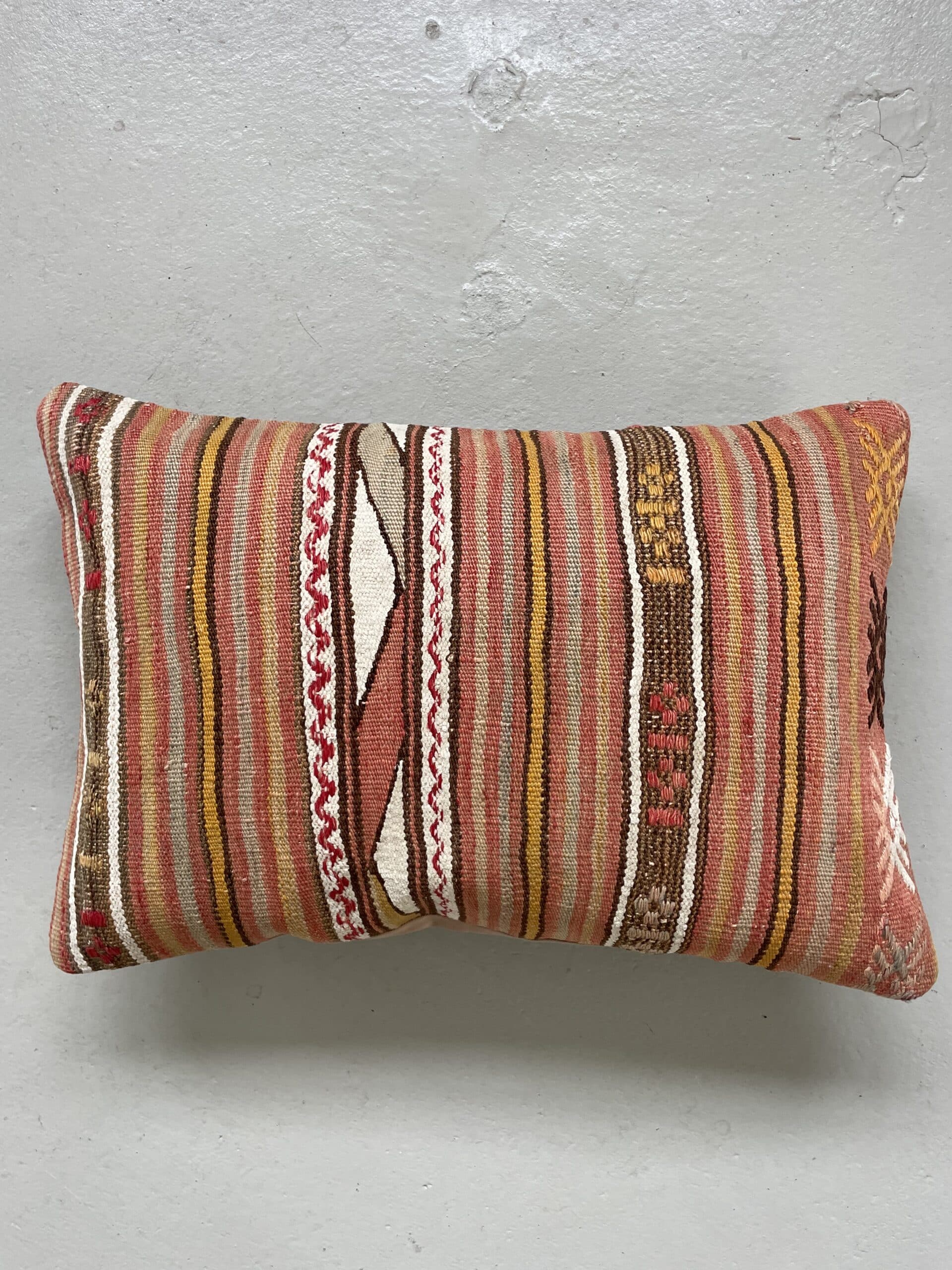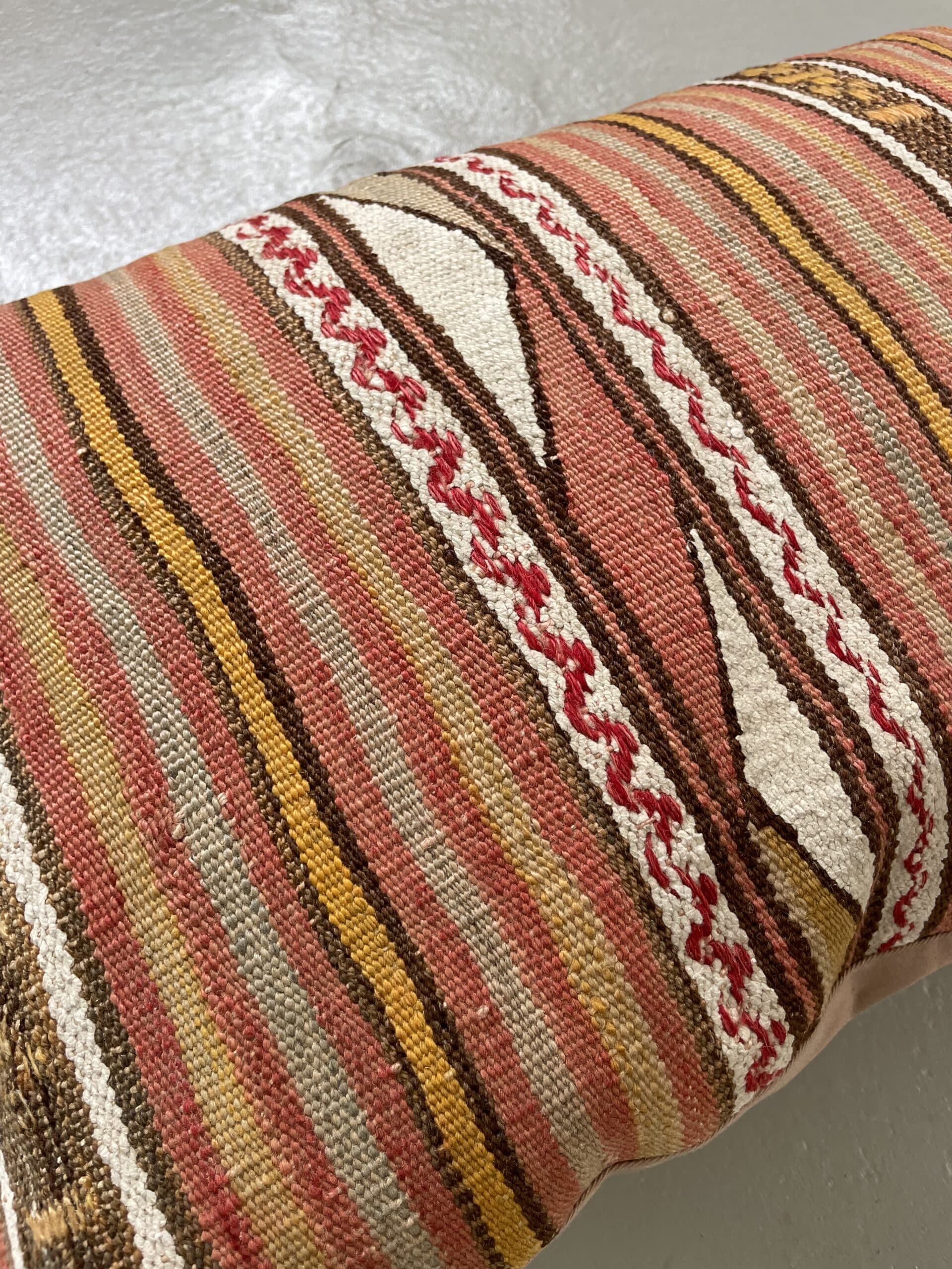 Vi har fundet en bunke smukke vintage puder, syet op af gamle kelimtæpper – hver pude er unika, så du får præcis den pude du ser her på billedet.