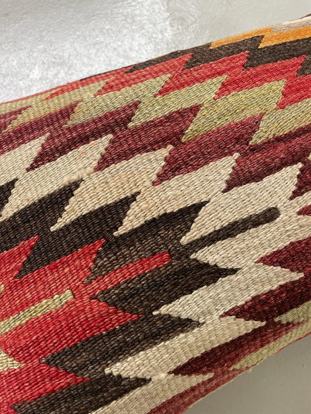 Vi har fundet en bunke smukke vintage puder, syet op af gamle kelimtæpper – hver pude er unika, så du får præcis den pude du ser her på billedet.