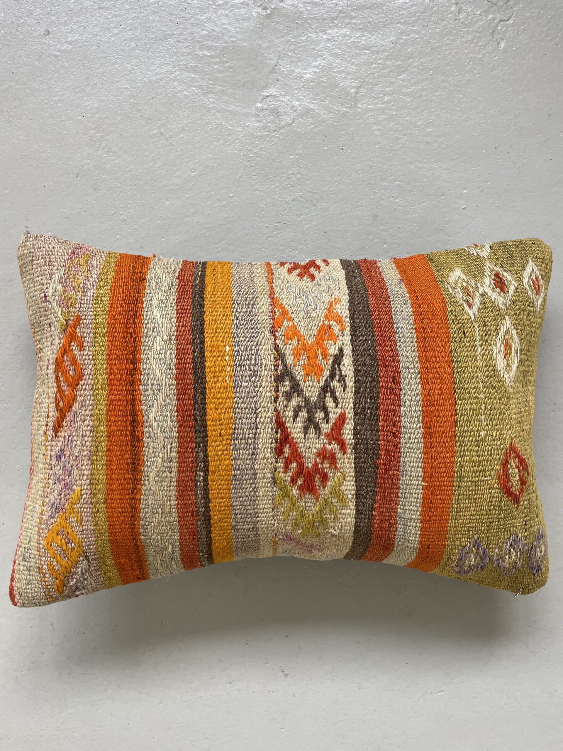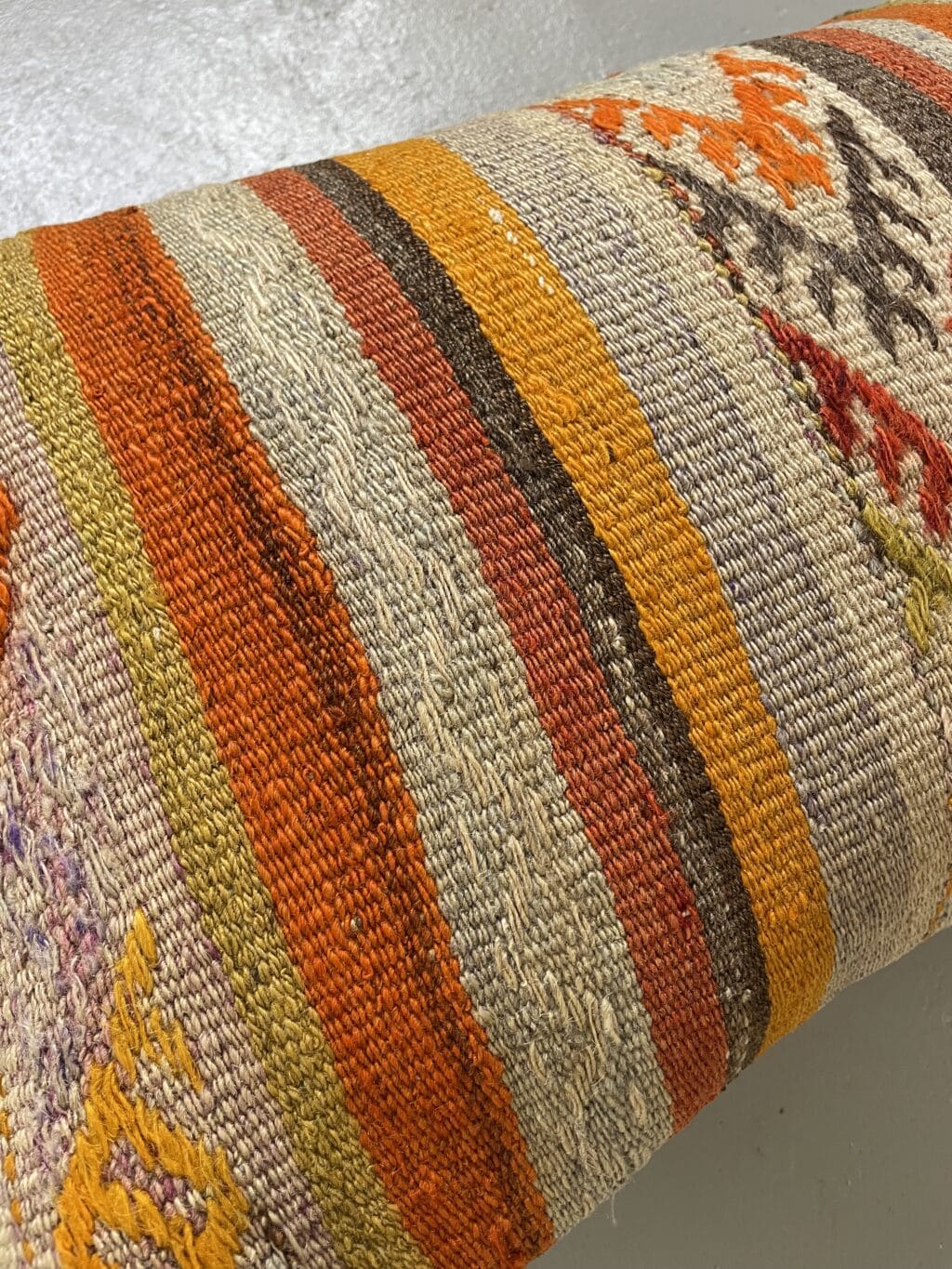 Vi har fundet en bunke smukke vintage puder, syet op af gamle kelimtæpper – hver pude er unika, så du får præcis den pude du ser her på billedet.