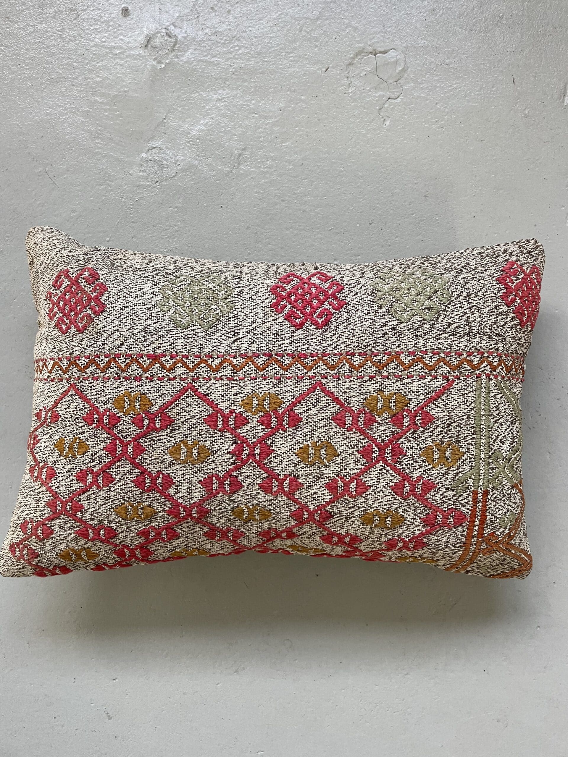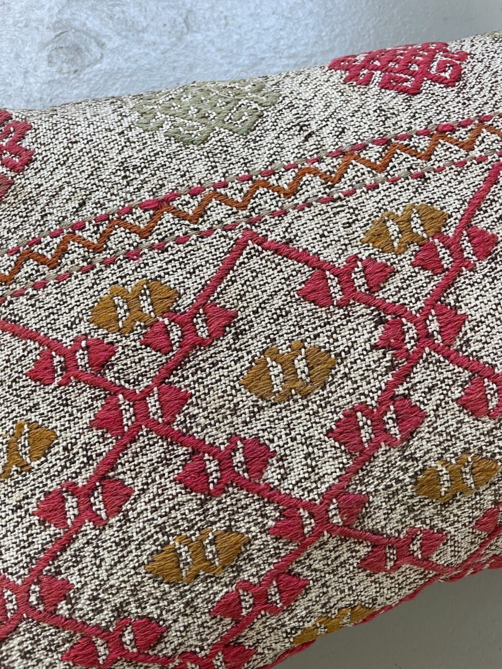 Vi har fundet en bunke smukke vintage puder, syet op af gamle kelimtæpper – hver pude er unika, så du får præcis den pude du ser her på billedet.