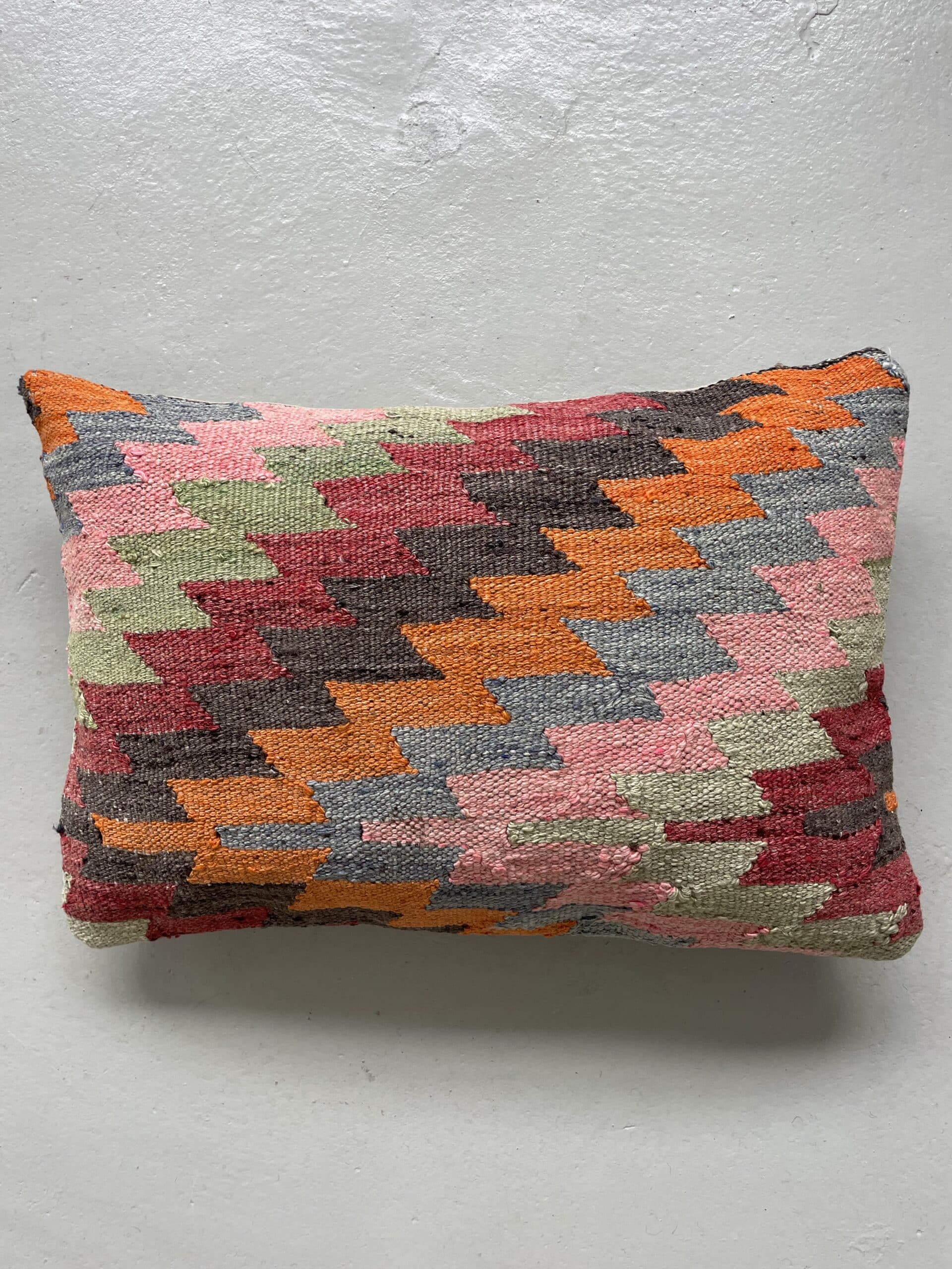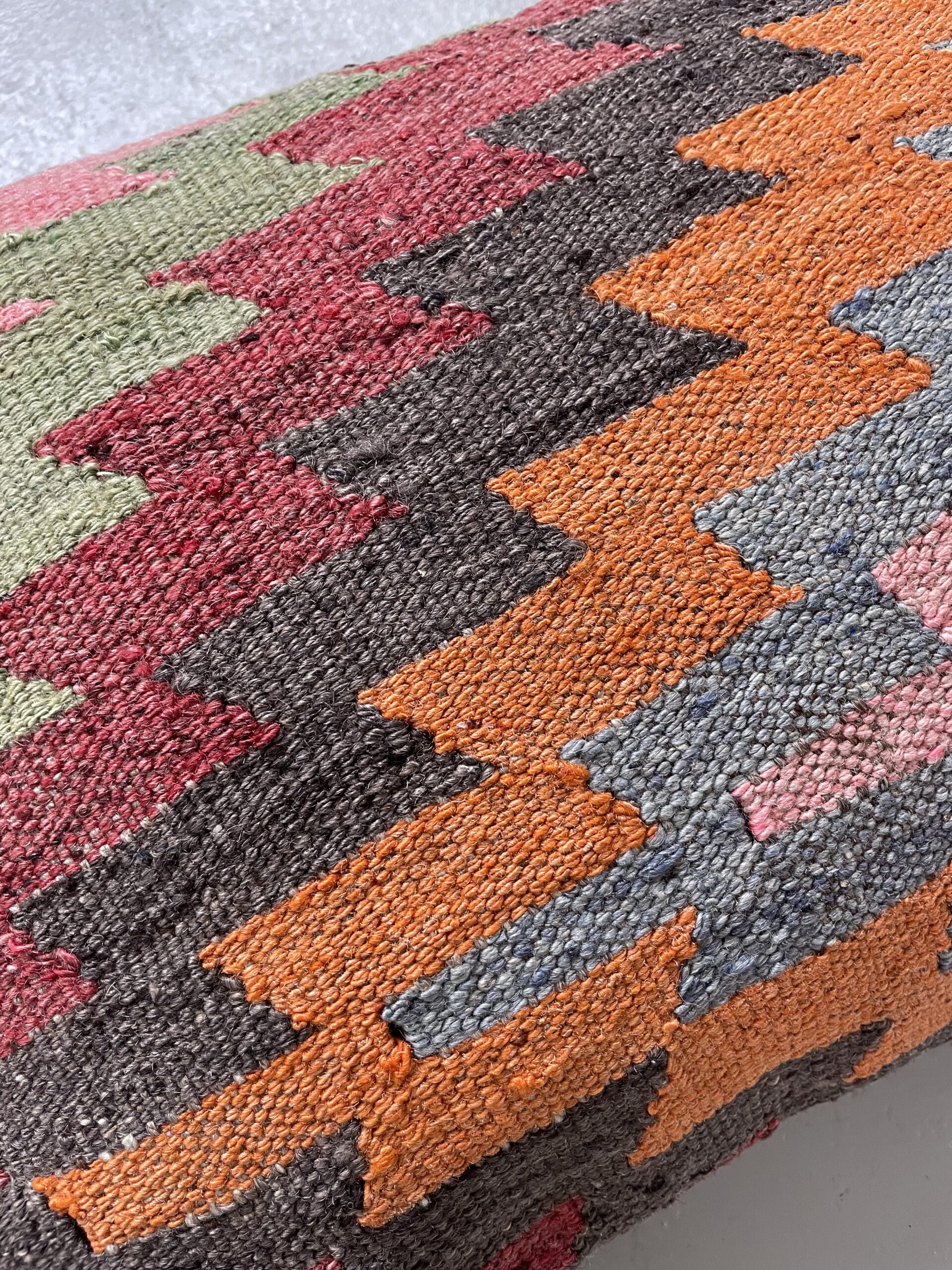 Vi har fundet en bunke smukke vintage puder, syet op af gamle kelimtæpper – hver pude er unika, så du får præcis den pude du ser her på billedet.