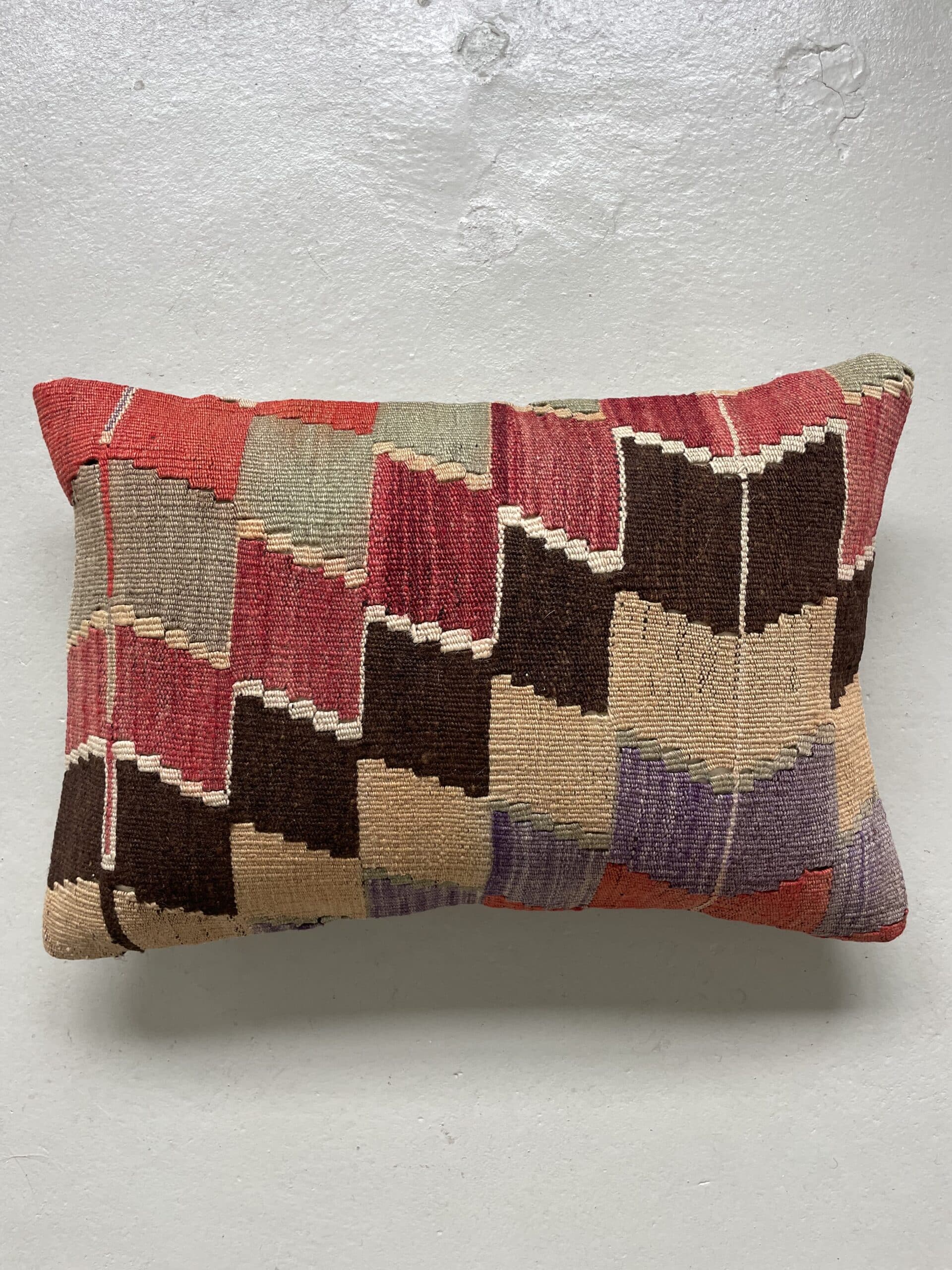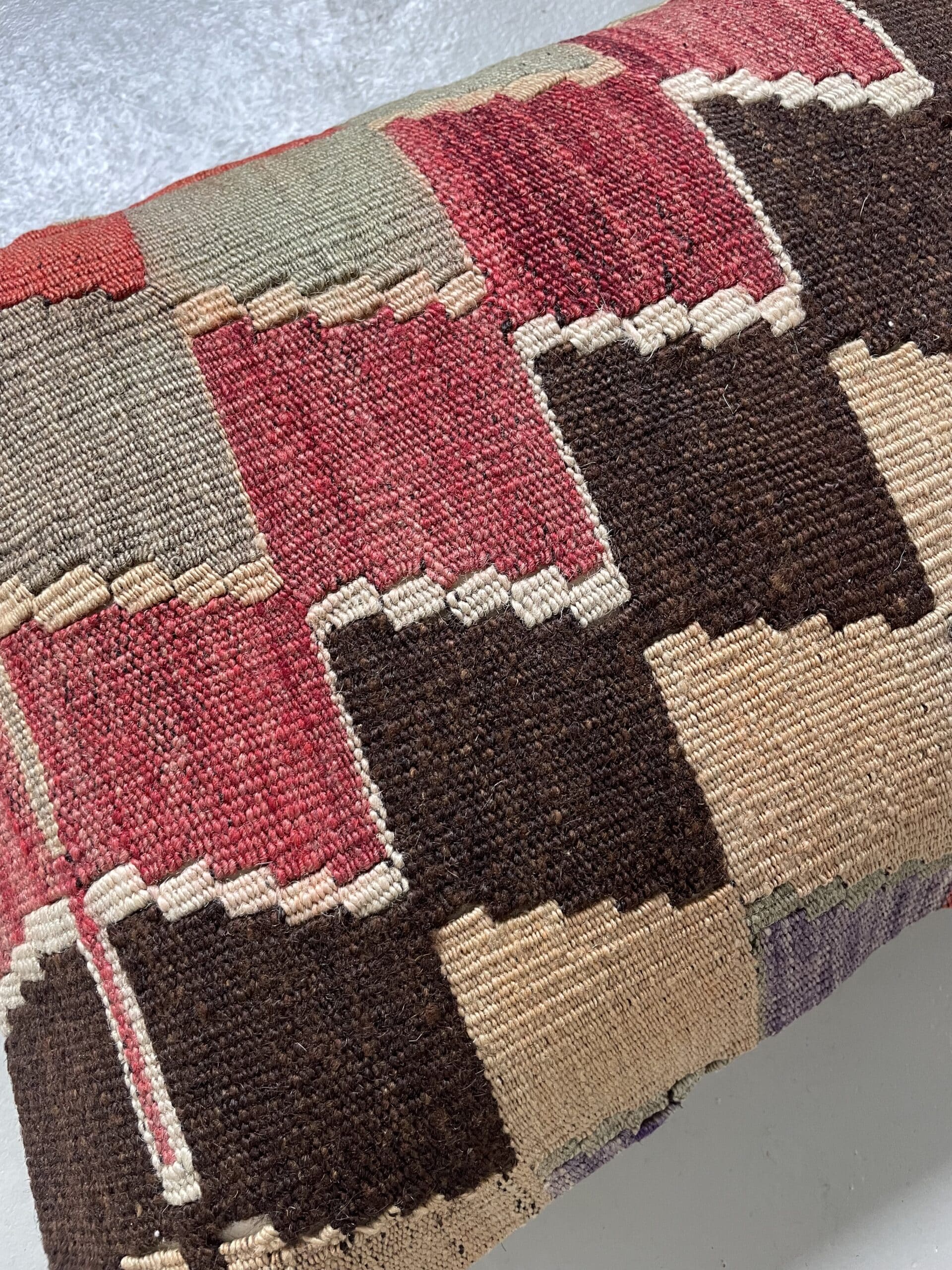 Vi har fundet en bunke smukke vintage puder, syet op af gamle kelimtæpper – hver pude er unika, så du får præcis den pude du ser her på billedet.