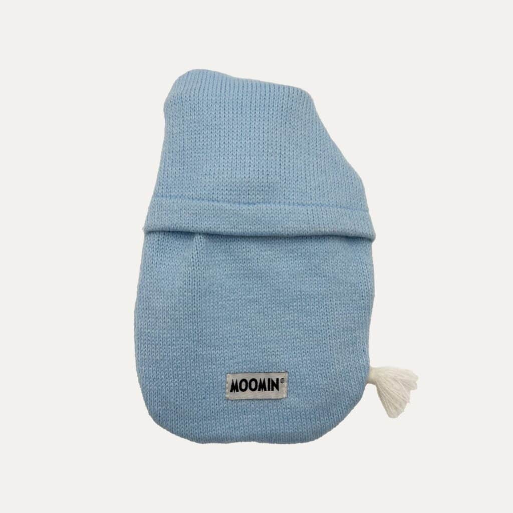 Lille varmedunk med lyseblåt cover i strik og den søde Mumi fra Mumitroldene.