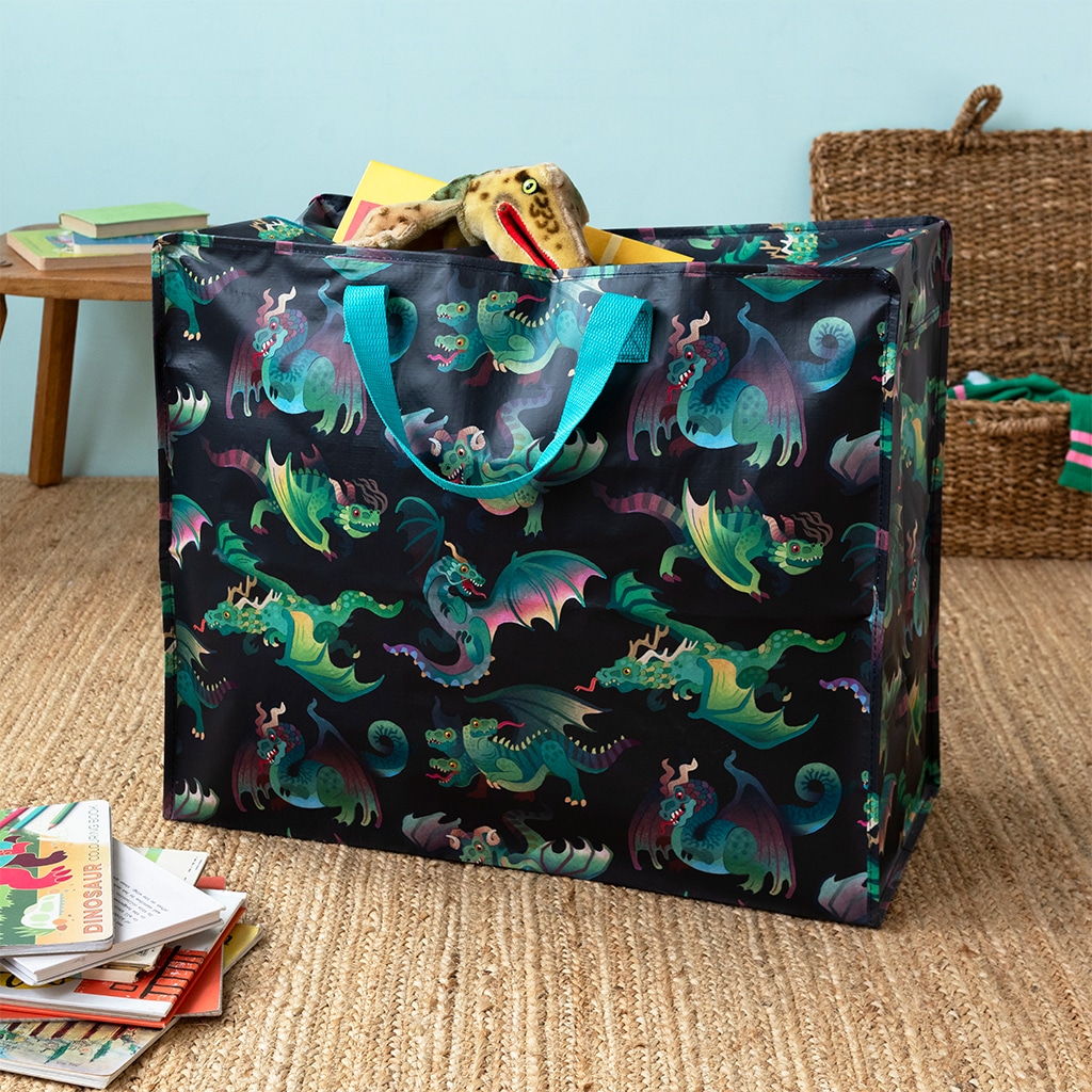 Opbevaringsposerne findes med mange forskellige motiver og dette fine drage-motiv er lige noget for de små drenge.