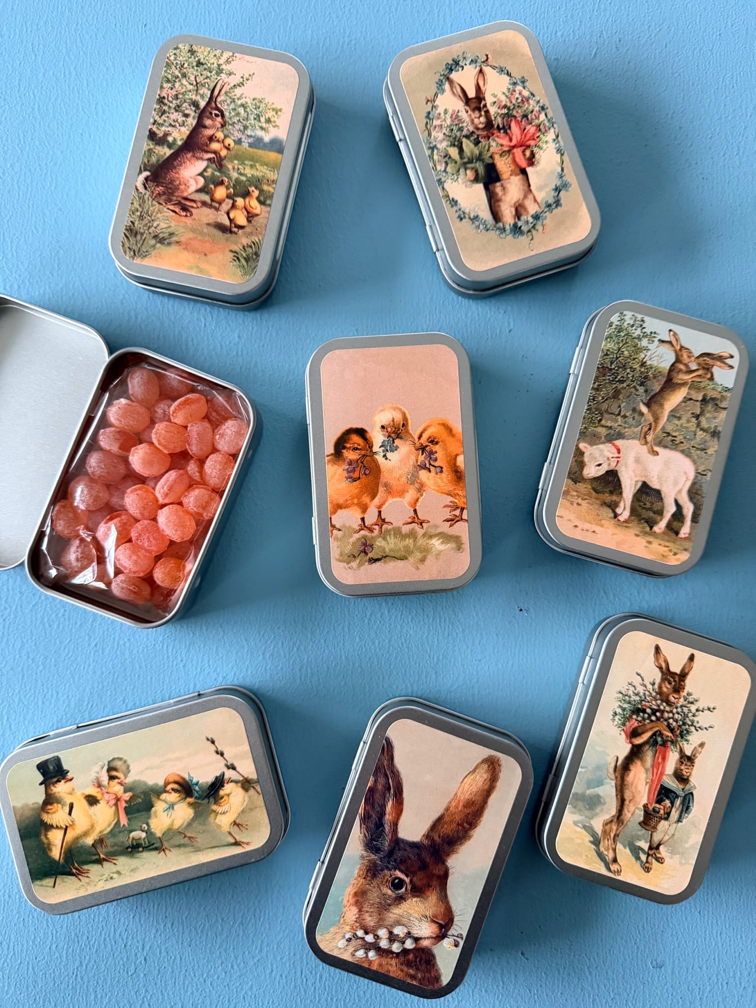 Æsken er prydet med hyggelige påskebilleder af kyllinger, lam, kaniner og mere. .