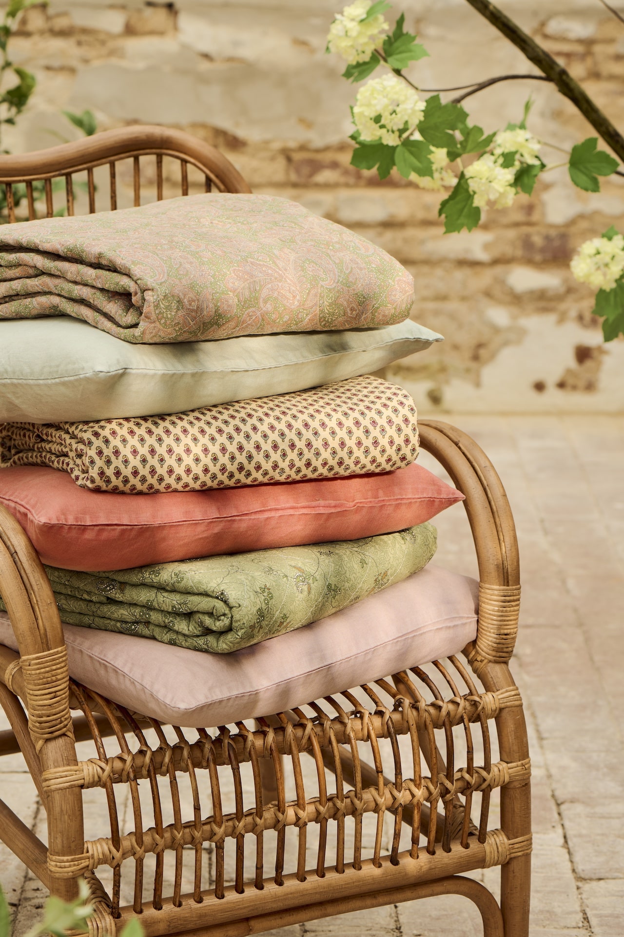 Super lækker blød quiltet plaid i bomuld – her i grøn med rosa paisleymønster.