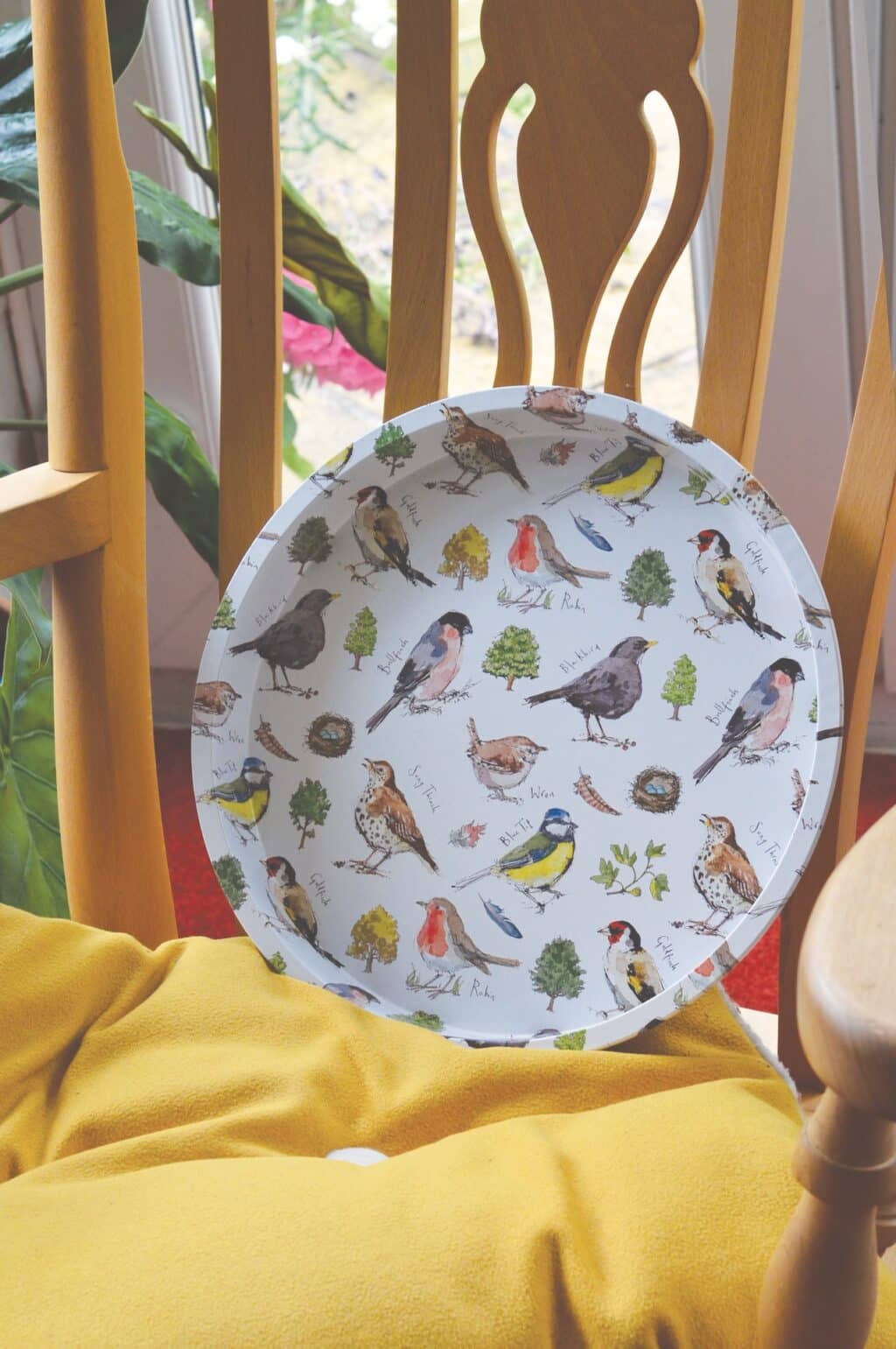Smuk og dekorativ metalbakke med det fineste fugleprint.