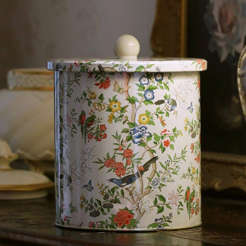Rundt om dåsen er den prydet med skønne fugle, der er asiatisk inspireret og ligeledes smukke blomster.