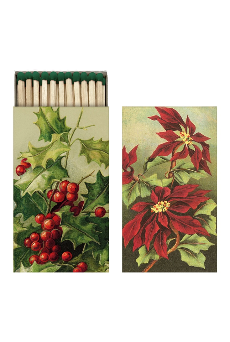 På æskens ene side er et motiv af en kristtorn med røde bær og på den anden side er der motiv af røde blomster.
